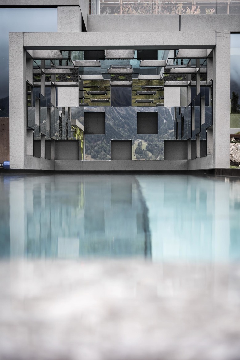 Moreover, using a reflective glass surface delivers an unexpected, scenic effect: the different shapes virtually fade into the background and meld into a ‘screen’ mirroring the gargantuan silhouette of the Zugspitze. And there’s more. The pool runs flush along the length of the Spa’s glass front, thus doubling the image of the mountain thanks to impactful chromatic mirror effects.