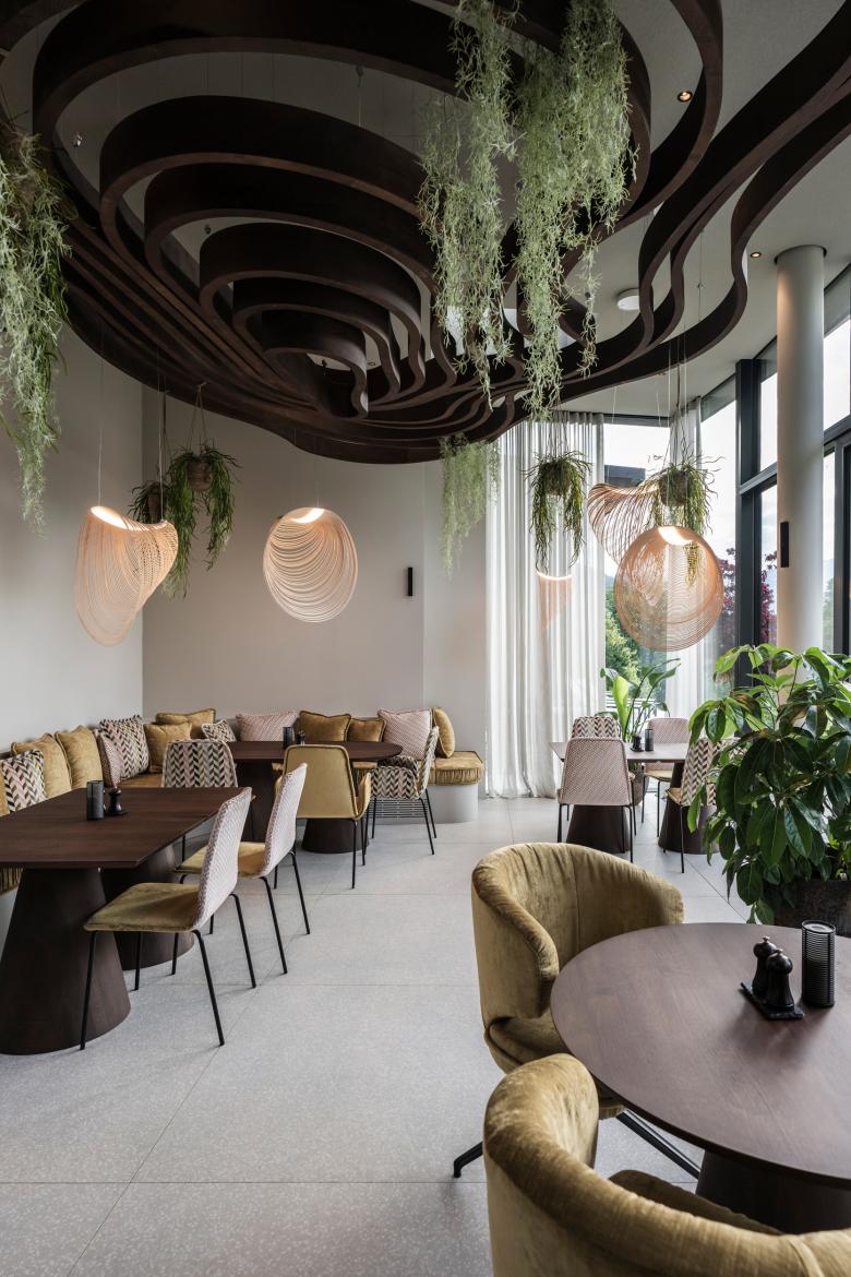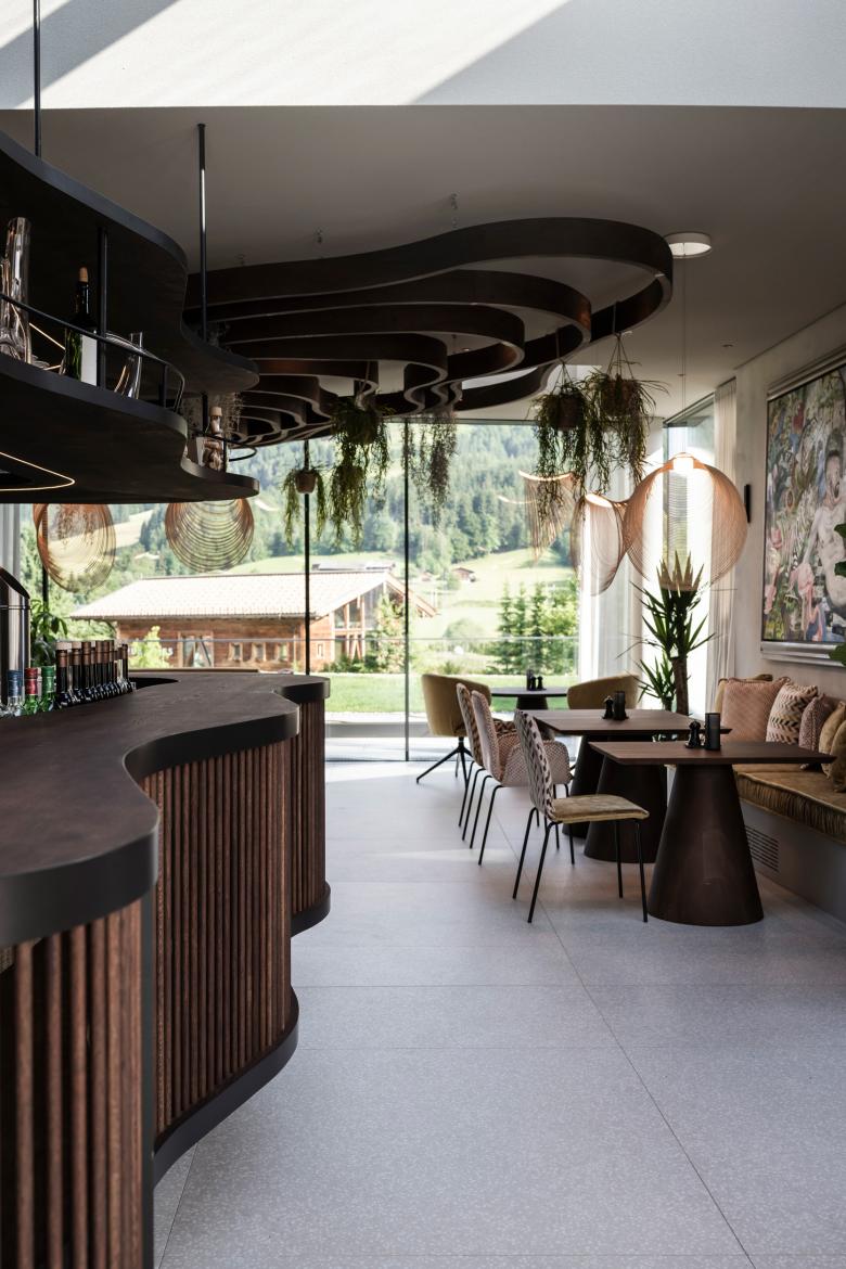 On the upper floor, the new à la carte restaurant Ess-Enz is a true fusion of all elements. On the south side, the building is only apparent as architecture at this level, albeit discreetly and still true to the terrain. The transparency provided by the large glass fronts and the recessed skylights create an airy lightness and allow impressive views of the pond, pool and sky. In the interior, organically shaped ceiling elements made of wood with hanging plants recreate the height profile of a mountain. The lights laser-cut from wood, which seem to vibrate with the air circulation, further enhance the sense of weightlessness, while the compact seating islands, with fabric covers that are partly plain and partly patterned, keep the design grounded.