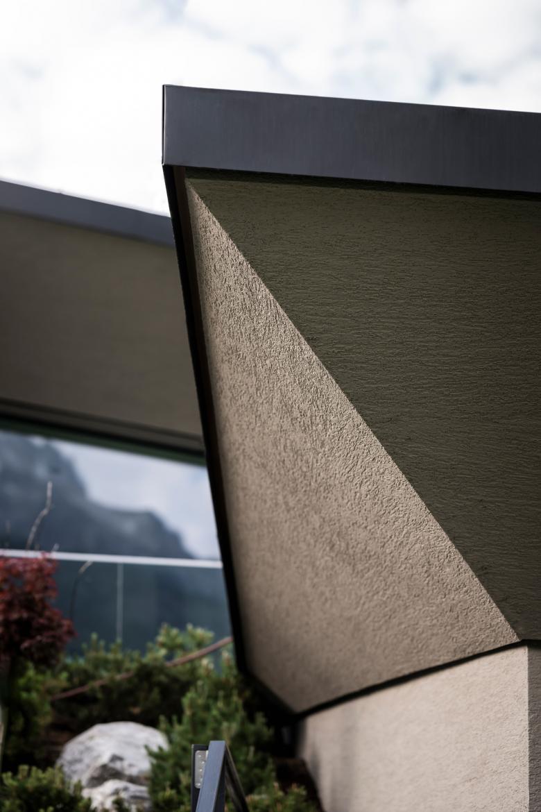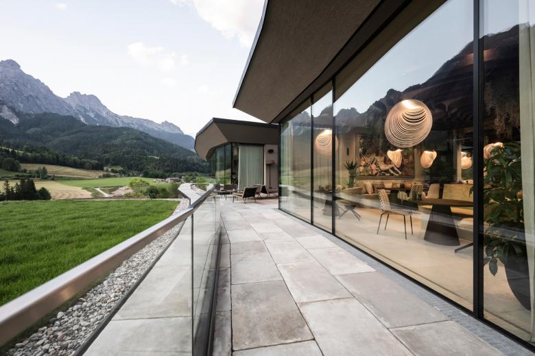 Adjacent to the restaurant, a sun terrace oriented in different directions offers a view of the mountain panorama and the meadows. The space is characterised by the tilted section of the projecting roofs, whose architectural silhouette changes constantly depending on the viewing angle. A very exciting open space is created between two closed structures, which strongly influences the perception of the landscape. Separated from the restaurant by the sun terrace are two other relaxation rooms, one with natural stone dedicated to the earth and the other with sisal surfaces open to the air. From here you can get return to the basement and the main pool. This completes the cycle of the wellness area at the point where the building merges back into the landscape.