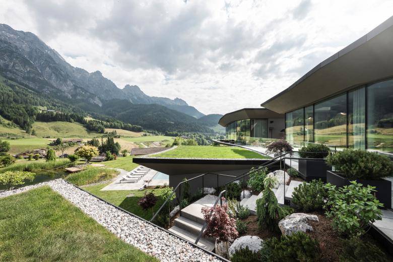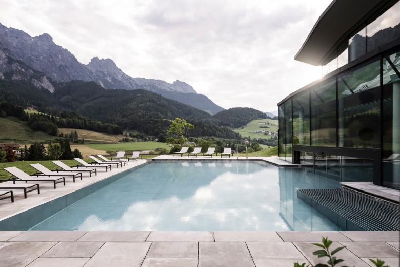 A breathtaking mountain backdrop, lush green meadows, a small lake and plenty of fresh air: All of this makes the Puradies nature resort in Leogang in Salzburger Land a haven of vitality, which NOA has expanded with the new spa themed around the elements of fire, water, earth and air.