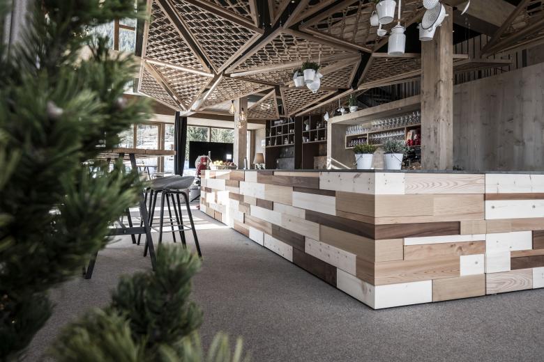 The area facing the village square can be used diversely and playfully. The two-story partially glass façade provides a generous openness to the space and offers one to be able to host a variety of different situations. When the stage and standing tables give way to the lounge situation, there are comfortable sitting areas with seating furniture around small tables between small exhibition boxes and fragrant plants and herb gardens hanging from the ceiling, which in turn are used for show cooking. The historic chandeliers, with their fresh black paint bring a cosy feeling and unique characteristic to the space. noa* came up with something extraordinary for the presentation of local quality products: four large wooden shelf racks, each with a recess to invite you to linger and allow you to immerse yourself even deeper in the region of South Tyrol. The back side consists of panels on which hay from the Passeier valley, bright vine leaves, fragrant pine chips from Seis are pressed together into a type of wallpaper and a simulated rock wall including climbing grips made in South Tyrol have been pressed. The three-dimensional effect not only tempts you to touch, but also lets you perceive the smells of the country intensely and let your mind wander.