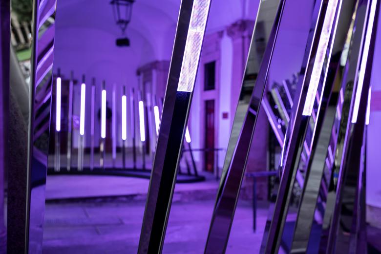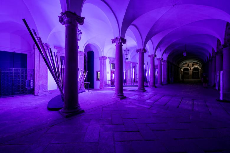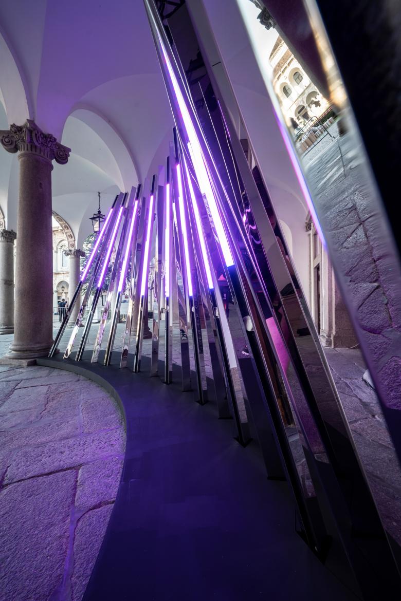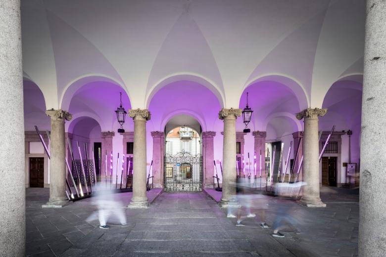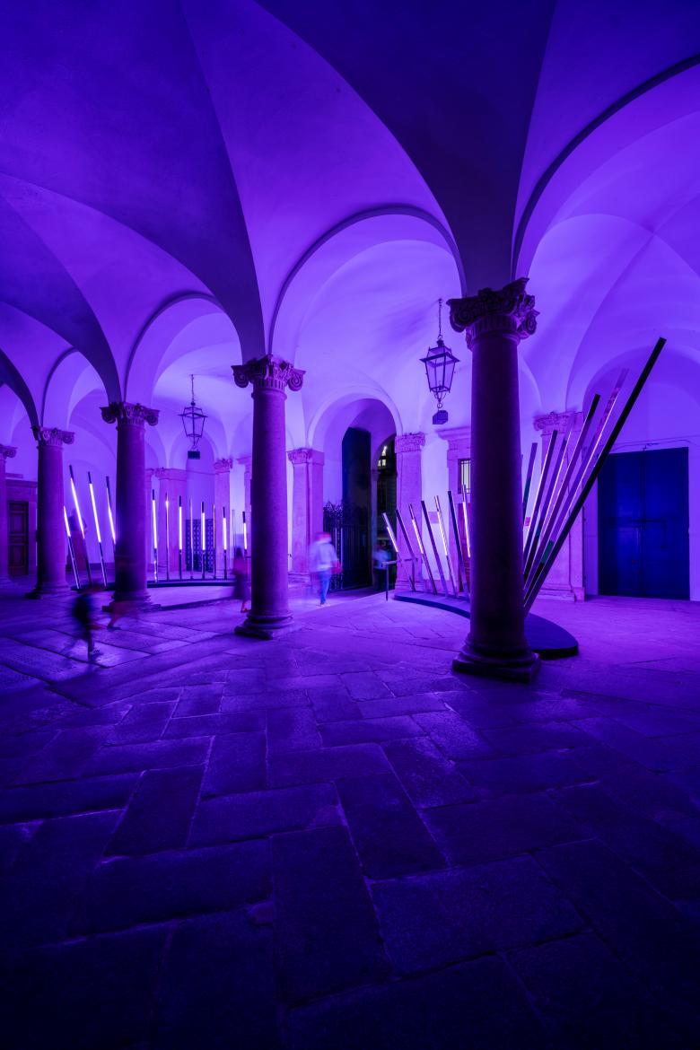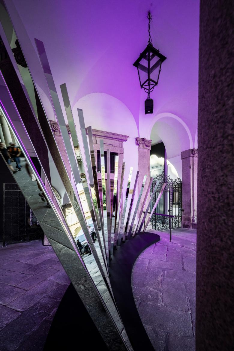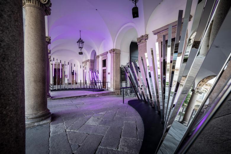 On either side of the doorway, a crown of structural light-beams open up, each one at different heights, visually amplifying the sequence of the 17th-century portico that serves as the setting for the installation. The result is a sculptural work that combines various elements, including light, sound and movement, in direct dialogue with people and with the space. The light beams create relationships, building ‘bridges’ between people. The light reacts to the presence of visitors and at the same time interprets the way they relate to each other. Through a ‘transsensorial’ mechanism, a light and musical score is created that is not only closely related to mass and volume, and thus to the number of visitors, but also becomes the driving force behind the installation. The result is an original and unique choreography of light and sound, which further enriches the visitors’ emotional journey.