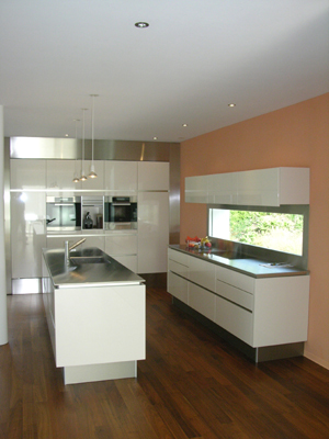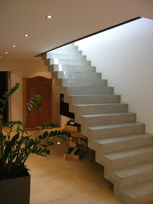 Das 3-gschossige Haus gliedert sich in 3 Zonen: 1. Eingangsgeschoss. Auf Strassenniveau betritt man das Haus und gelangt in den grosszügigen Eingangsbereich. Im rückwärtigen Bereich befindet sich die Treppe. Auf diesem Geschoss befinden sich ebenfalls die Doppelgarage, Keller, Waschküche, Garderobe sowie ein Gästezimmer mit Nasszelle. 2. Wohngeschoss. Der grosse, offen gestaltete und hohe (2.70m) Wohnraum gliedert sich in verschiedene Zonen, Kochen, Essen, Wohnen und Fernsehecke. Lediglich durchbrochen von einem WC. Innen- und Aussenraum fliessen hier ineinander und der Zugang zum grosszügigen Aussenbereich ist auf mehrere Seiten hin möglich. 3. Schlafgeschoss. Auf diesem Geschoss befinden sich das Kinderzimmer mit Nasszelle, ein Büro, sowie der Elternbereich mit Schlafzimmer und Badezimmerlandschaft. Von der Veranda aus lässt sich die Aussicht auf den Rhein geniessen.