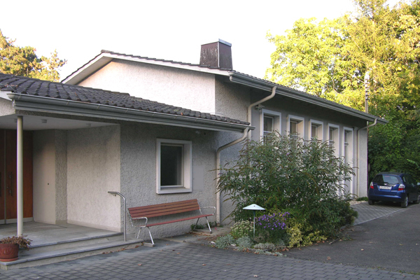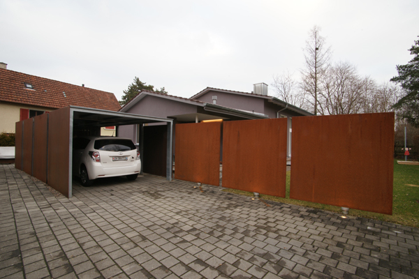 Das äussere Erscheinungsbild des Gebäudes wurde mit Ausnahme der neuen Fenstertüren zum südlichen Garten praktisch beibehalten. Lediglich ein Carport und bewegliche Sichtschutzelemente aus rostendem Stahl wurden dazugebaut.