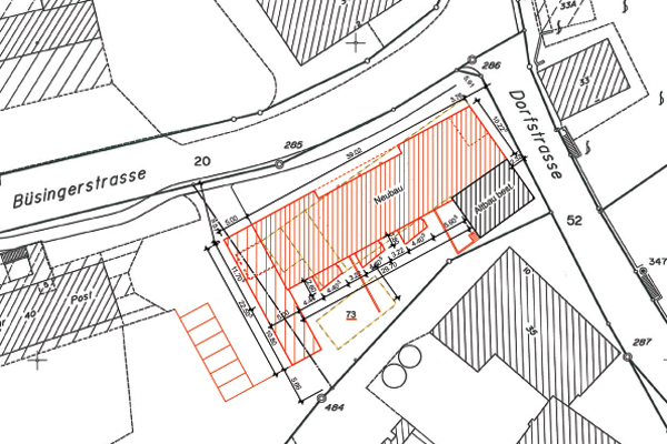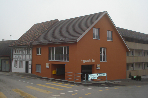Das Konzept ging davon aus, dass das denkmalgeschützte Wohnhaus stehen blieb. Die übrigen Ökonomiebauten wurden abgebrochen und an deren Stelle wurde neu gebaut. Die neue Disposition übernahm weitgehend die ursprüngliche Gebäudestellung an der Dorfstrasse und Büsingerstrasse. Das bestehende Wohnhaus wurde mit einem Neubau ergänzt, sodass an der Dorfstrasse ein Kopfbau entstand. Entlang der Büsingerstrasse wurde ein Längsbau errichtet. Durch diese Anordnung entstand gegen Süden ein gut geschützter und optimal besonnter Hof.