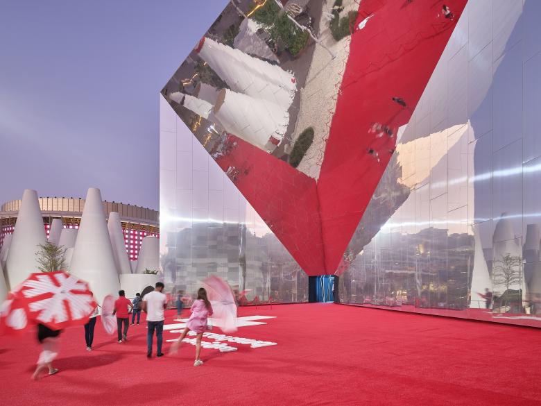 Mit «Reflections» wird eine innovative Umsetzung der von Präsenz Schweiz vorgegebenen Kernbotschaften in Raum und Erlebnis präsentiert. Der Baukörper verbindet Tradition und Innovation, skizziert Beziehungen zwischen Orient und Okzident und schafft eine einzigartige Präsenz: Die trichterförmig verspiegelte Front des Pavillons dient sowohl als spektakulärer Blickfang als auch als Reflexionsfläche.