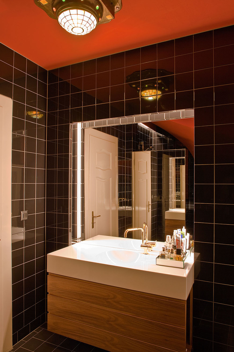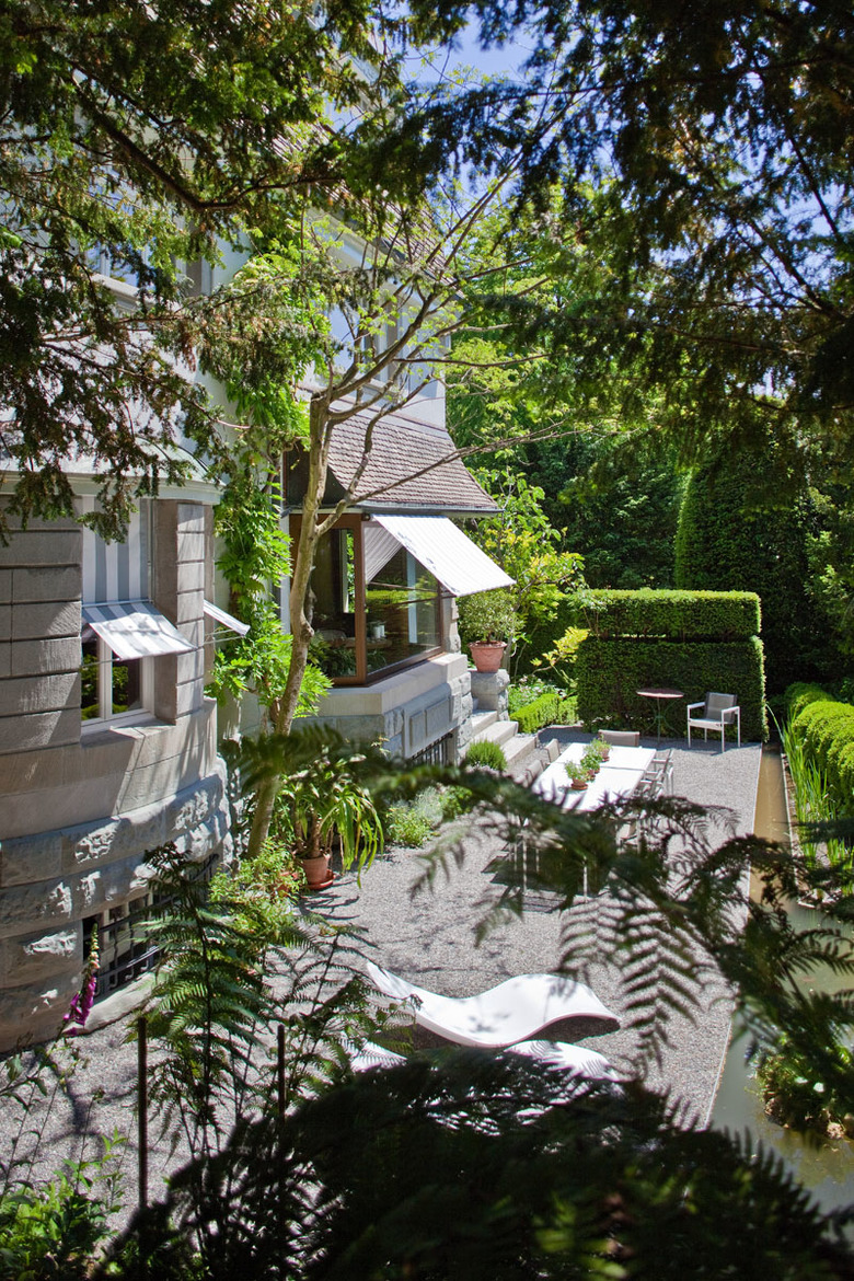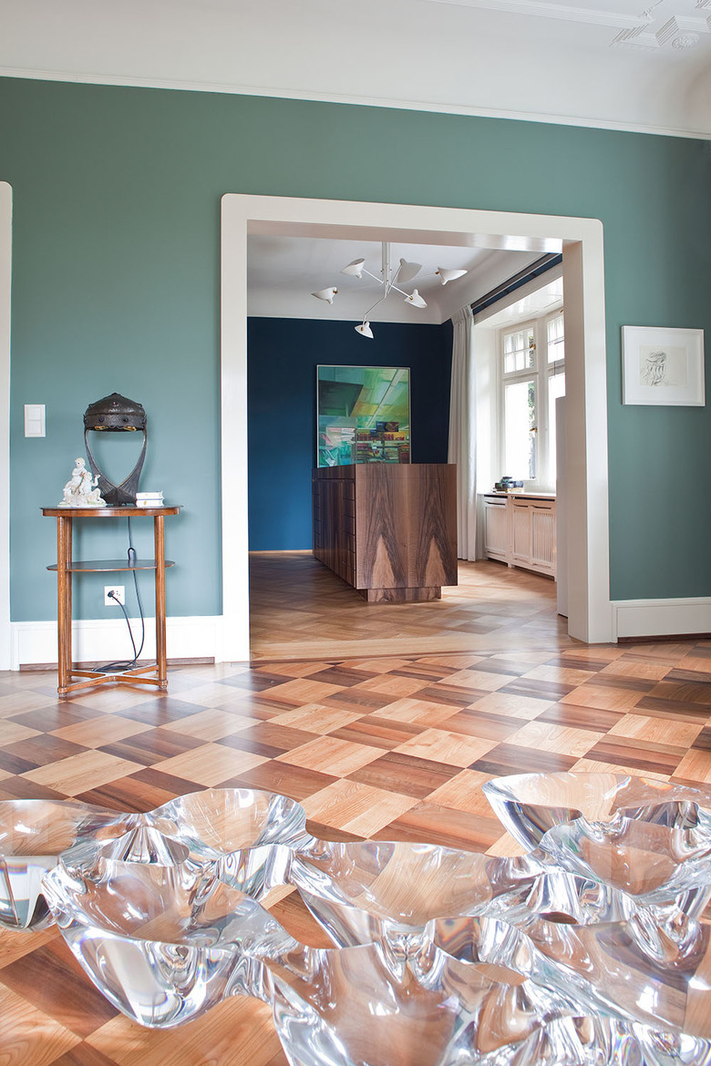 Ein erstes Konzept versuchte mittels präzis gesetzten Boden- und Deckendurchbrüchen ein Raumkontinuum über drei Wohngeschosse zu schaffen. Entstehen sollte ein sich erweiternder Raum als Bühne für die Kunstsammlung des Bauherrn, die sich in all ihren Bezügen untereinander ideal präsentiert. Die Eingriffe in die Struktur standen jedoch den Ansprüchen des schützenswerten Objekts entgegen. Das ausgeführte Konzept respektiert nun die Geschosse und beschränkt sich auf eine Durchlässigkeit und die Verbindung der Räume im Erdgeschoss mittels exakt gesetzter Durchbrüche und der Öffnung zugemauerter Fenster.