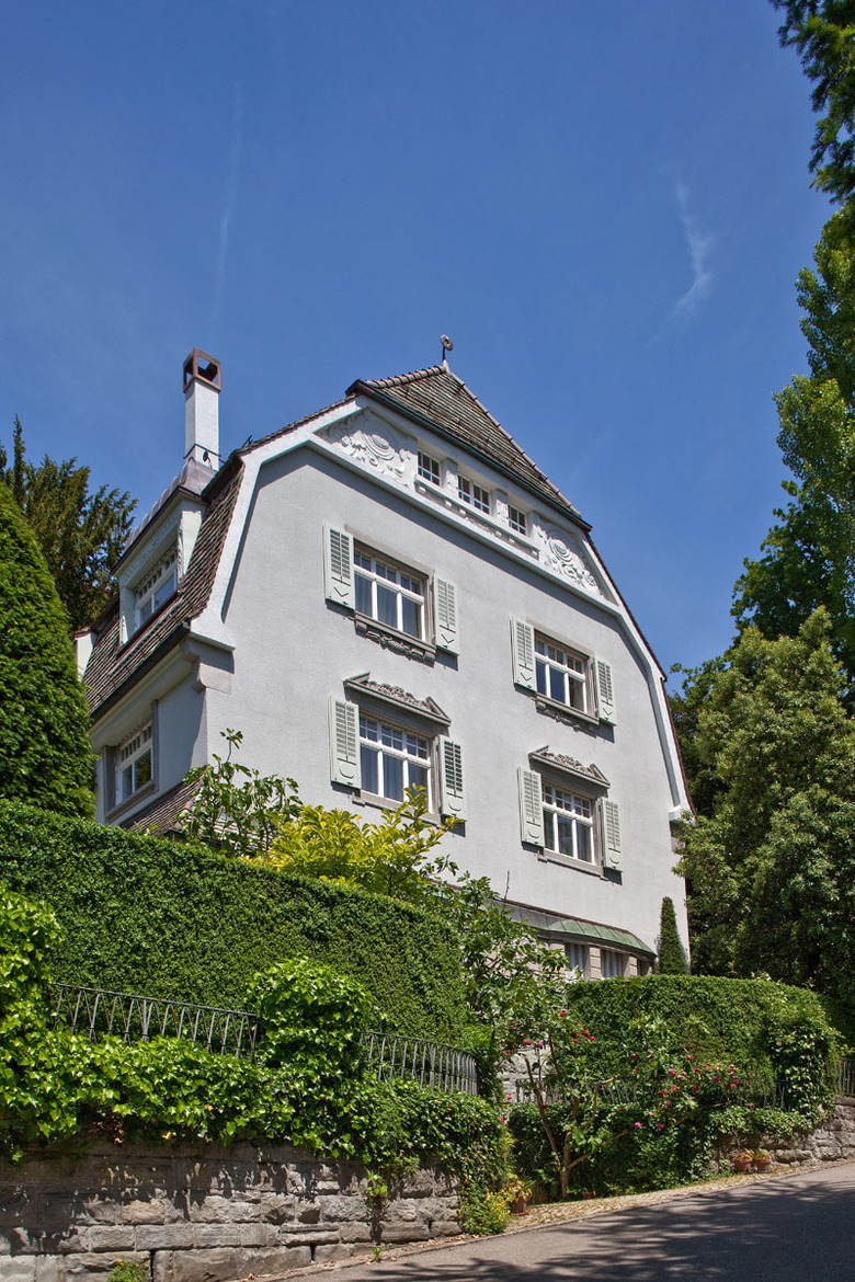 „Während die ursprüngliche Lage der Küche im Kellergeschoss noch auf die Bautradition des 19. Jahrhunderts verweist, kündigen sich im schlichten Grundriss der Villa, den flächigen Fassaden, den gerundeten Zimmerecken und dem tief herabgezogenen Mansardwalmdach bereits der vom 1905 gegründeten Schweizer Heimatschutz propagierte Reformstil an. Die Villa erinnert an Vorbilder des deutschen Reformstils, wie beispielsweise um 1900 auf der Mathildenhöhe in Darmstadt von den Architekten Josef Maria Olbrich (eigene Villa von 1901), Peter Behrens und andern realisiert wurde.“