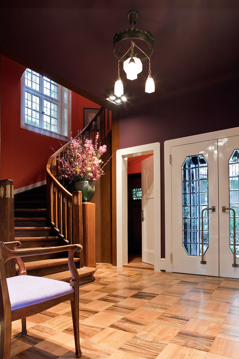 Die Oberflächen Aussen (Verputz, Fenster, Dach) wurden erneuert, ebenso wie im Innern (Wände, Böden, Decken). Auch fast alle technischen Installationen wurden erneuert. Die besten bleibenden Elemente waren jeweils Ausgangspunkt für die neue Gestaltung: Die neuen Fenster orientieren sich an an der ursprünglichen, nach Fotos rekonstruierten Fassung. Die neuen Tafelparkette orientieren sich an den vorhandenen. Und die einzige noch vorhandene Jugendstil-Stukk-Decke inspirierte den Bauherrn dazu, für jeden Wohnraum einen Künstler zu beauftragen, eine Neufassung mit selbst gewähltem Thema zu erarbeiten.