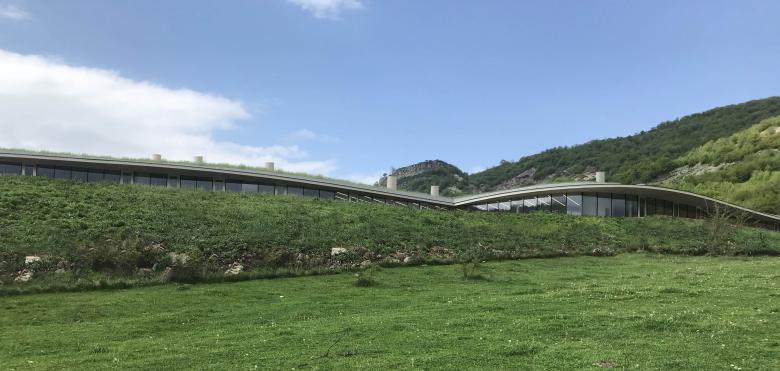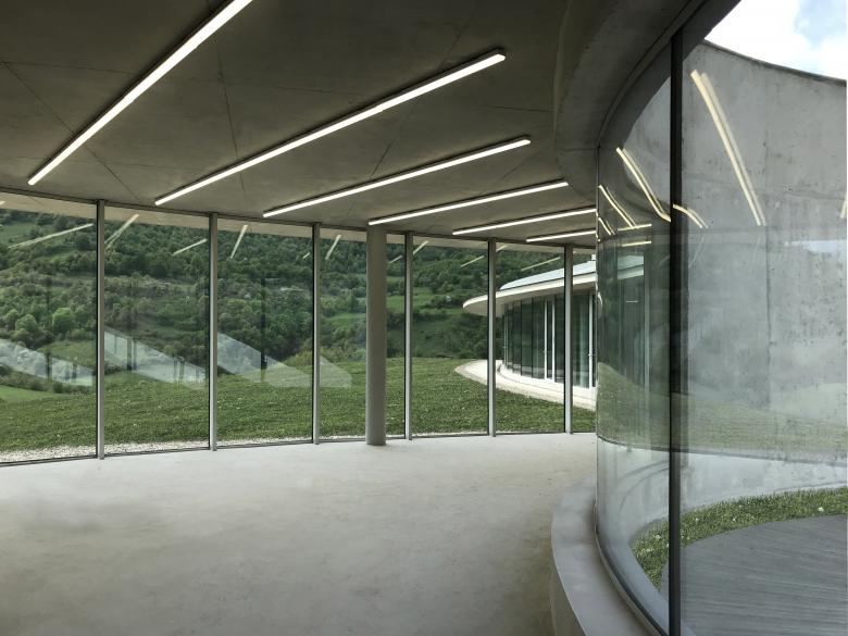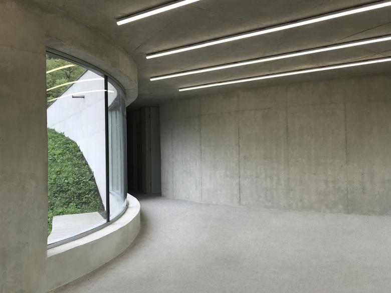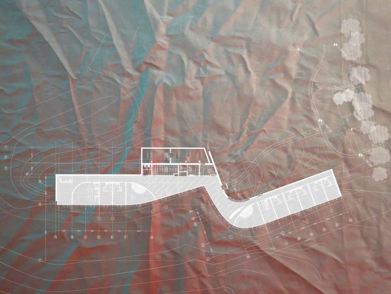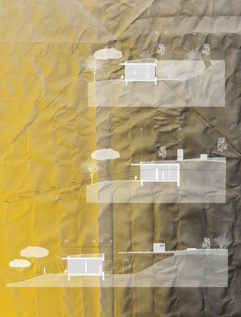 Beyond the main structure of the campus a sheer wall nestled in the descending landscape marks the entrance to the guest quarters. The sheer wall takes volume when the visitor enters through the gate. In turn, the volume shatters itself into an extension towards the landscape that unravels beyond its long glazed facade.