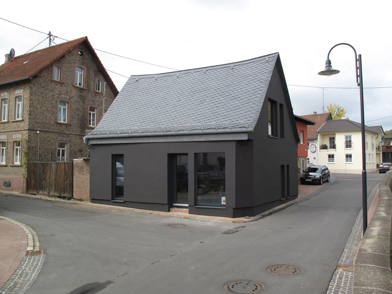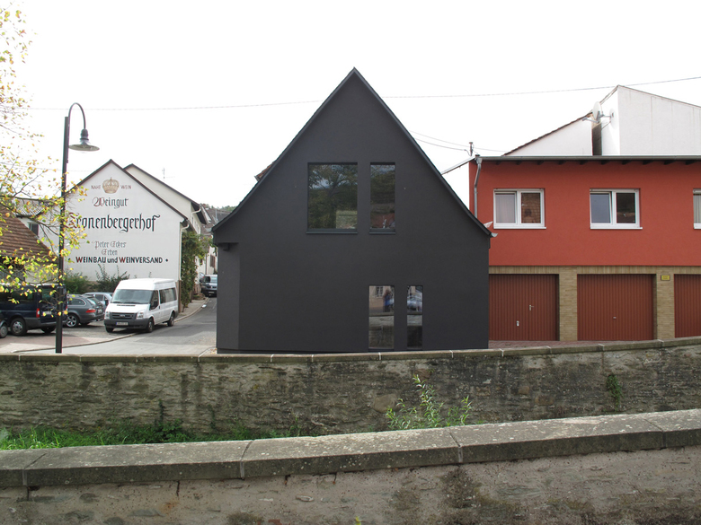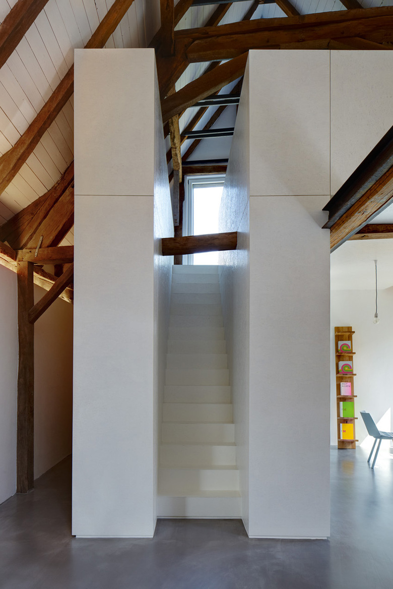 Für den Umbau einer 102 Jahre alten Scheune in Büroräume für The Borsellinos, Design Agentur und Herausgeber des Magazins Aortica, wurden der existierenden historischen Struktur der Scheune moderne Formen und Merkmale entgegengesetzt. Das Äußere und das Dach des historischen Gebäudes sind in schwarz gehalten und kreieren so ein Spannungsverhältnis zum unmittelbaren Umfeld und den angrenzenden, traditionellen Gebäuden. Neue, absolut reduzierte Fenster- und Türelemente kommunizieren ebenfalls die moderne Ästhetik. Im Kontrast zum Äußeren, sind im Inneren des Gebäudes alle Wände in weiß gehalten. Ein speziell entworfenes Möbel, das sich bewusst mit seiner geradlinigen Form vom Bestand absetzt, beherbergt neue Funktionen wie WC, Küche, Schrank, Treppe und die zusätzlichen Arbeitsplätze auf der Galerie. Die Eigenständigkeit der Struktur wird dadurch betont, dass sie orthogonal frei im Raum steht und sich nicht an den schrägen Winkeln des Bestandes orientiert. Das Projekt wurde zusammen mit Architekt Fabian Mainzer entworfen und in enger Abstimmung mit den Besitzern realisiert.