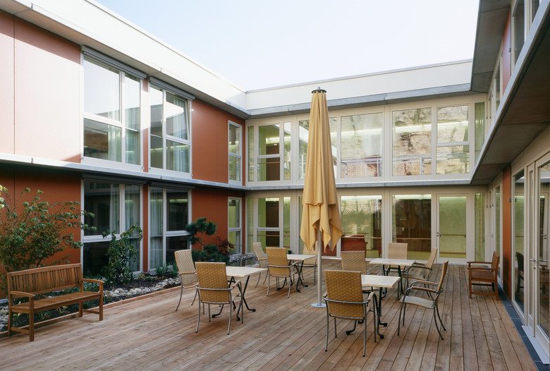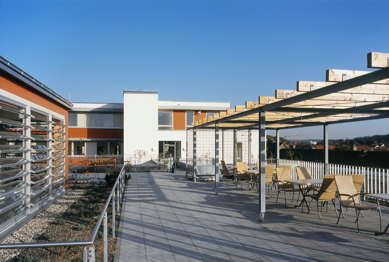 Ein Haus wie eine Stadt, eine Stadt wie ein Haus – Dieser Gedanke Albertis, des italienischen Baumeisters der Renaissance, spiegelt sich im Entwurfsansatz des Pflegeheims wieder: Man erkennt öffentliche und private Bereiche, Straßen und Wege, Plätze. Durch offene Zäsuren ist das Gebäude in 3 Bauteile gegliedert.