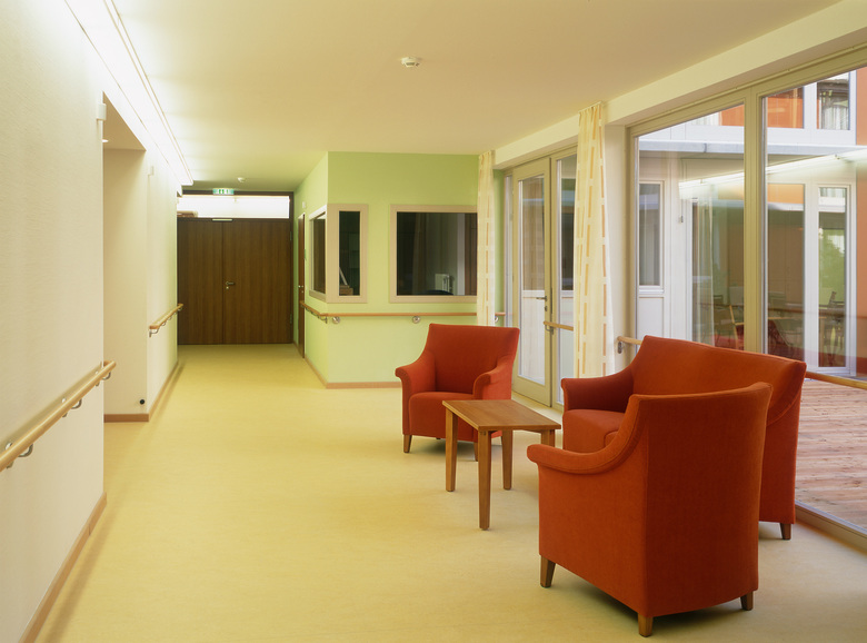 Das Pflegeheim belegt den 1. und 2. Baukörper. Im Erdgeschoß befinden sich Foyer, Verwaltung, Personalräume, Garage und Haustechnik. Das Foyer mit Haupteingang ist als 3- geschossiger zentraler Innenraum ausgebildet mit der Haupttreppe, Aufzug und den umlaufenden Fluren in den Obergeschossen. Die Pflegegruppen sind im 1. und 2. Obergeschoß angeordnet. In jeder Pflegeetage befinden sich 30 Pflegezimmer mit insgesamt 32 Betten. Die Funktionsräume sind dezentral angeordnet um im täglichen Betrieb kurze Wege zu ermöglichen. Beide Gebäudeteile des Pflegeheimes sind jeweils um einen Innenhof gruppiert, im 1. Baukörper ein offener Grünraum, der der Dementenstation zugeordnet ist, im 2. Baukörper um die 3. geschossige Halle. Alle Bauteile sind mit Brücken verbunden, das neue Pflegeheim wird mit einem Verbindungsgang an das bestehende Pflegeheim angeschlossen.
