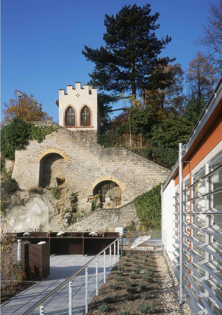 Ausgangssituation war die nur noch zum Teil bebaute, brachliegende Brauerei Denner, mit deren einsturzgefährdeten Bausubstanz und die historische Andreasstaffel. Die Andreasstaffel stellt eine wichtige fußläufige Verbindung zwischen der Huttenstraße und der etwa 20 Meter höherliegenden Adolf- Bieringer-Straße dar. Nach Abriß der bestehenden Gebäude wurde eine Hangsicherung mit Spritzbeton, Vernagelung und Seilnetzverspannung durchgeführt.