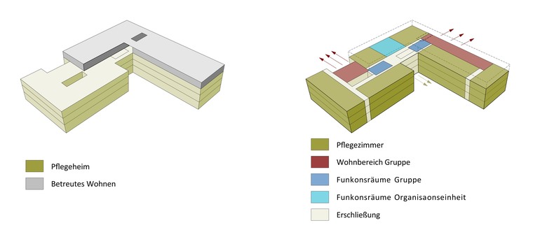 Ziele und Maßnahmen Pflegeheim – Der Entwurf verfolgt die Ziele einer modernen Pflege: Viel Tageslicht zur Stabilisierung des Tagesrythmus der Bewohner durch tageslichtbeleuchtete Flure und Lichthöfe. Orientierung der Wohnräume nach O/S/W, gruppiert um überschaubare gemeinsame Wohnbereiche an denen die Küchen direkt anschließen. Zentraler Lage des Pflegestützpunktes. Integration in den Öffentlichen Raum. Der leicht zurückgesetzte Eingangsbereich ist großzügig zur Johanniterstrasse orientiert. Der Multifunktionsraum ist von dort aus erreichbar und so platziert, dass auch eine Fremdnutzung für den Stadtteil möglich ist. Eine der beiden Wohngruppen ist U-förmig um einen hellen nach Westen geöffneten Wohnbereich orientiert die andere um einen länglichen Wohnbereich gruppiert mit einem großen Prospekt zum öffentlichen Raum der Johanniterstrasse.