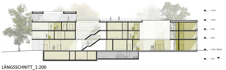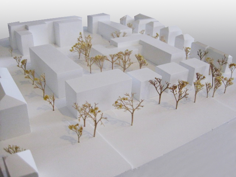 Städtebau – Die städtebauliche Dichte nimmt kontinuierlich von der Innenstadt kommend in Richtung NO ab, die Bebauung lockert sich auf. Diese Tendenz bildet sich auch im geplanten Quartier ab. Im Quartier selber ist uns eine gleichberechtigte Platzierung von Wohnen und Pflege wichtig. Beide sollen eine Adresse an der Straße haben, am begrünten Innenhof partizipieren und unabhängig voneinander realisierbar sein. Der Baumbestand im Innenhof soll weitestgehend geschont werden, insbesondere die besonders wertvollen Bäume.