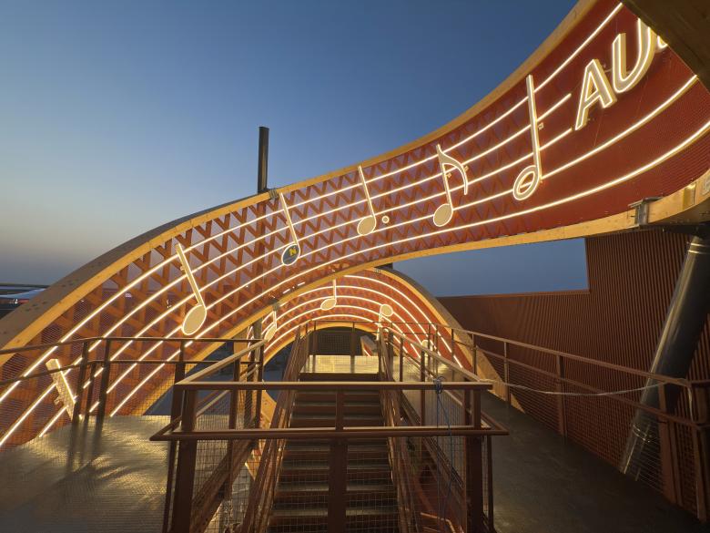 Eine ikonische Spiralskulptur erhebt sich spektakulär in die Höhe und fungiert als visuelles Leitmotiv des Österreich-Pavillons auf der Weltausstellung. Aus der Nähe betrachtet, entpuppt sie sich als überdimensionales Notenband aus Holz, das die ersten Takte der „Ode an die Freude“ trägt. Die Spirale besitzt eine universelle, kulturell übergreifende Symbolkraft. Sie lädt ein, über die zyklischen Bewegungen des Lebens, über Wandel, Wachstum und Transformation nachzudenken - jenseits linearer Fortschrittsmodelle.