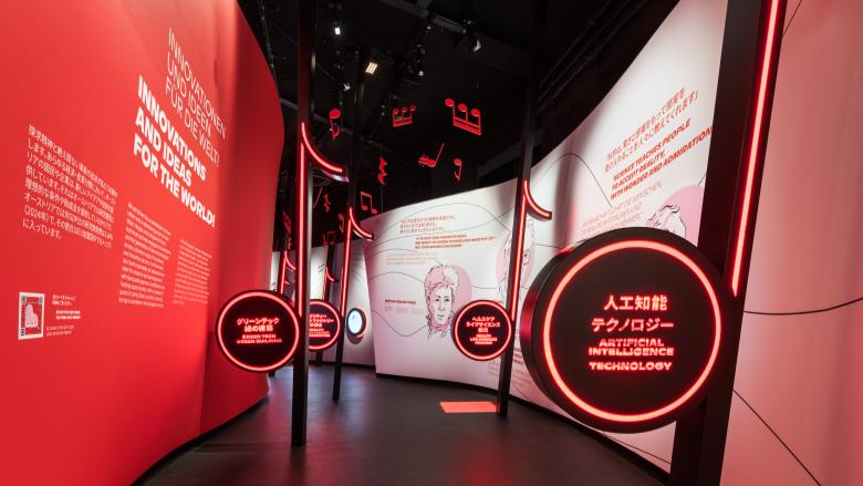 Im Inneren des Pavillons gliedert sich die Ausstellung in drei Räume. Im ersten Raum erwacht das Notenband und dient als Projektionsfläche: Hier erleben die Besucher*innen die Vielfalt der Beziehungen zwischen Österreich und Japan in einem faszinierenden musikalischen Opening. Danach erkunden die Besucher an übergroßen interaktiven Noten spielerisch die Vielfalt und Leistungsfähigkeit der österreichischen Wirtschaft und Gesellschaft. Den Höhepunkt der Ausstellung bildet der letzte Raum – die Kathedrale der Zukunft. Hier kann man sich interaktiv mit der Zukunft auseinander setzen und selbst an der Komposition der Zukunft mitwirken – gemäß dem Motto „Composing the Future“.