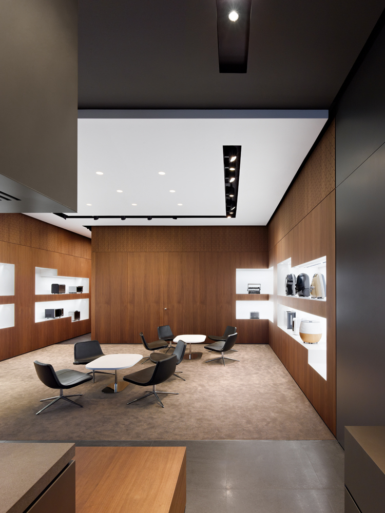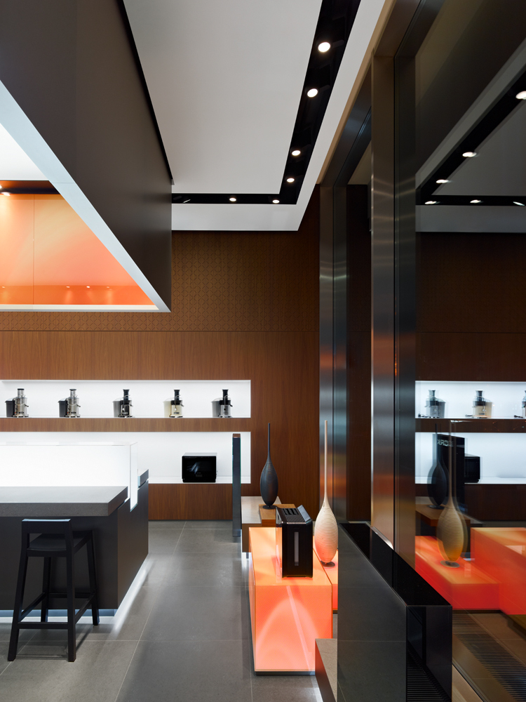 Der warm-orange „glow“ innerhalb des abgehängten Deckenelementes entsteht durch farbig bedruckte Glasflächen, die von oben durch eine homogen leuchtende Foliendecke illuminiert werden. Parallel zur Foliendecke nehmen mattschwarze Deckenkanäle die Strahler zur punktuellen Produktinszenierung auf. Die schwebende Leichtigkeit der Displays erzeugen LED-Strips im Sockelbereich, deren Licht durch einen weichen Diffusor mild vom polierten Granitboden reflektiert wird.