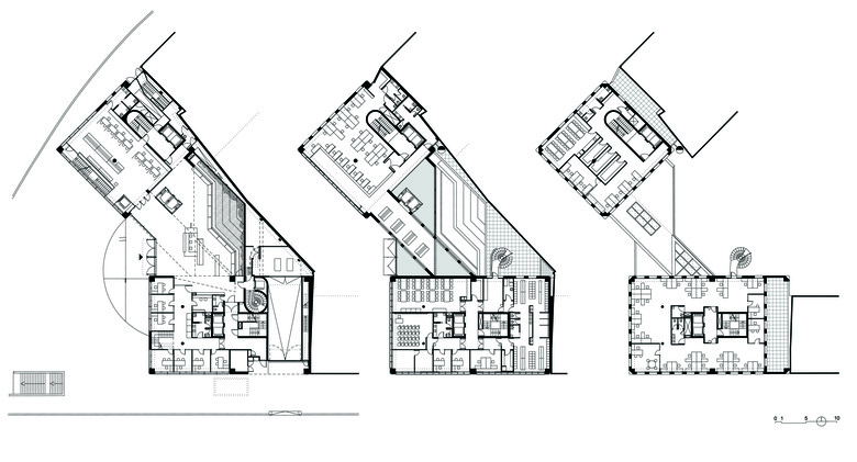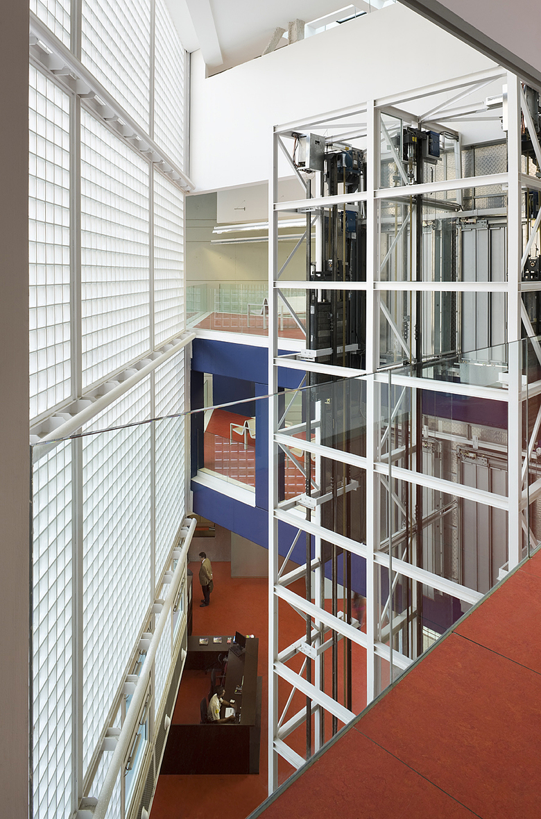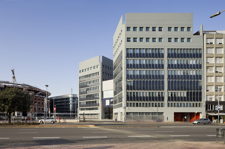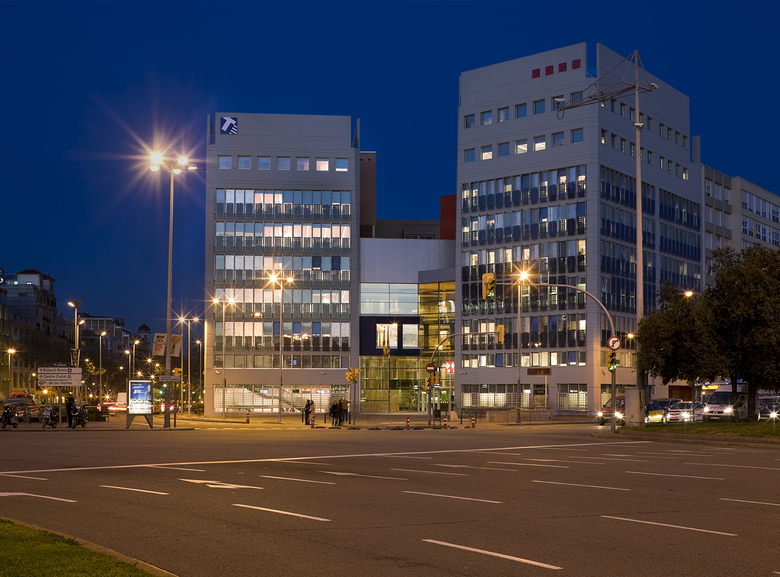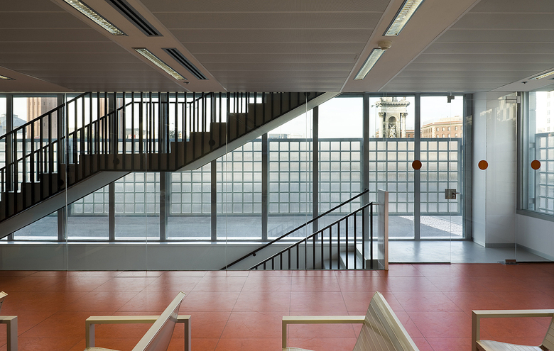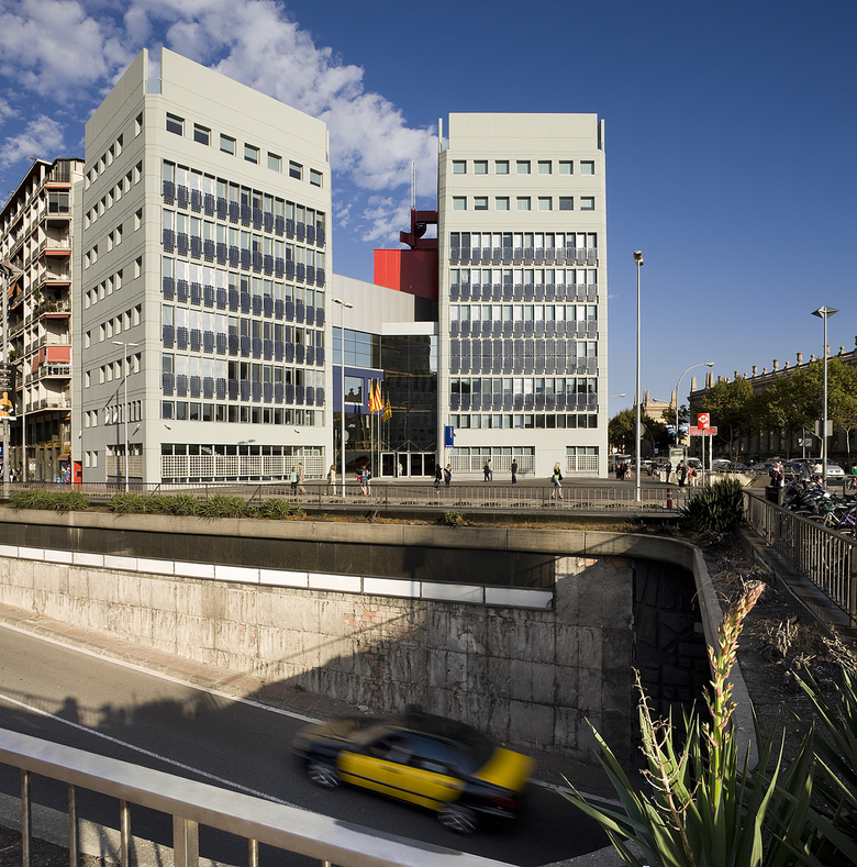 The site of the Police Station lay wedged between the converging of two of Barcelona's main avenues and faced the circular square “Plaça d'Espanya”. The urban solution had to solve the problem of different height regulations between the two avenues and at the same time address the monumentality of the circular place. The decision to create a building with two wings was weighed by the fact the three separate police organizations were required to share a common entrance and vestibule for a waiting public. Given that it was to be a representative building of the law enforcement in a democratic society the vestibule had to have an air of friendly assistance to the public while observing all the required security arrangements. The four-storey glazed atrium with a garden court beyond is set between the two wings. The façades are composed with a continuous module of galvanized steel fins enclosing the glazing screened with photovoltaic balconies on the south and west sides to use the solar energy as a clean sustainable energy integrated into the building. There is a vague classical reference to base, column, and cornise, typical of the buildings in Cerda's grid center, with glass-brick screens at the base and plain concrete walls pierced with windows at the top.