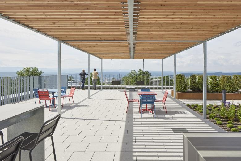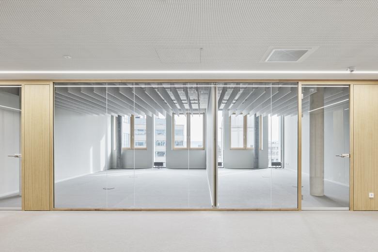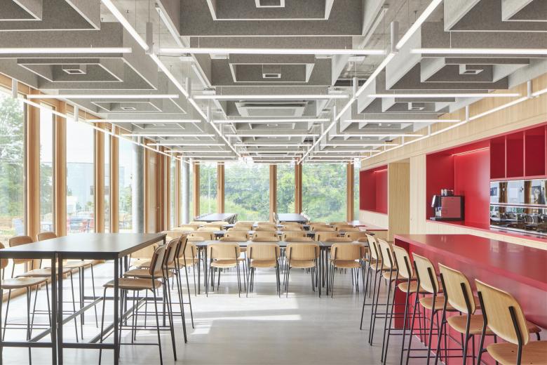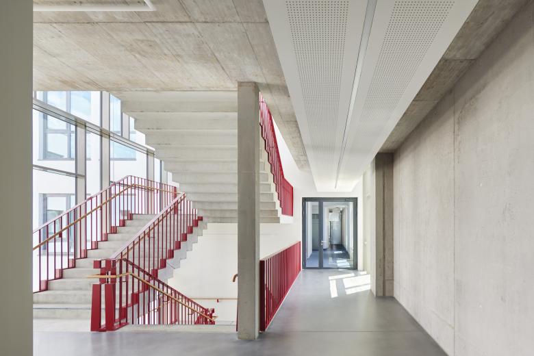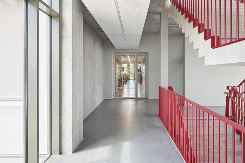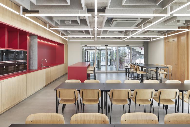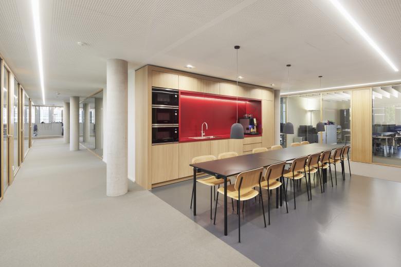 Die Teamzonen, bestehend aus Teeküchen, Aufenthaltsbereichen und einer Cafeteria, sind wie einzelne Perlen in einer Kette über das gesamte Gebäude verteilt. Mit einer auffällig kräftigen roten Farbgebung heben sie sich von der ansonsten harmonisierenden Farbpalette ab und markieren die identitätsstiftenden Gemeinschaftszonen in den verschiedenen Unternehmensbereichen. Das neu gestaltete Treppenhaus fungiert als verbindendes Element, das diese "Perlen" miteinander verknüpft. Sein kräftig rotes Geländer fungiert wie ein Band und schafft eine übergeordnete Logik der Raumsequenzen, die die räumliche Kohärenz verstärkt.