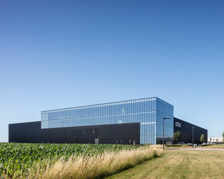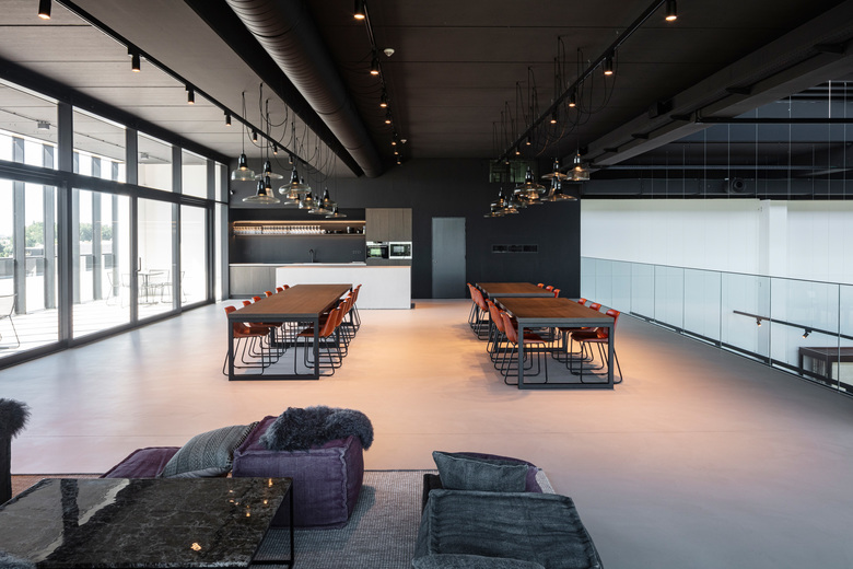 The future-oriented building and its interior are characterized by a simple and stern outline. On top of the production hall, a glazed volume reveals a dynamic work space tailored to the needs of the client and oriented to the new way of working to stimulate social interaction, teamwork and exchange of knowledge.