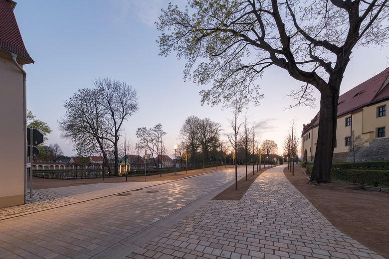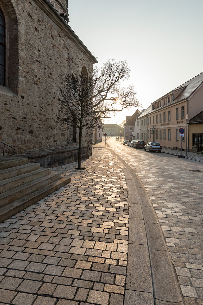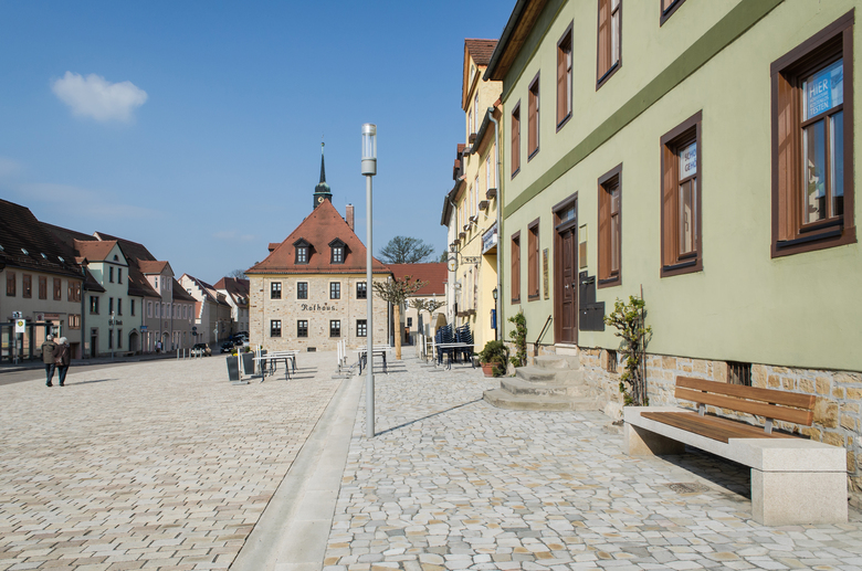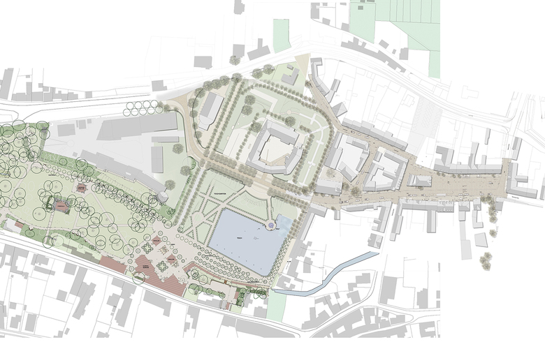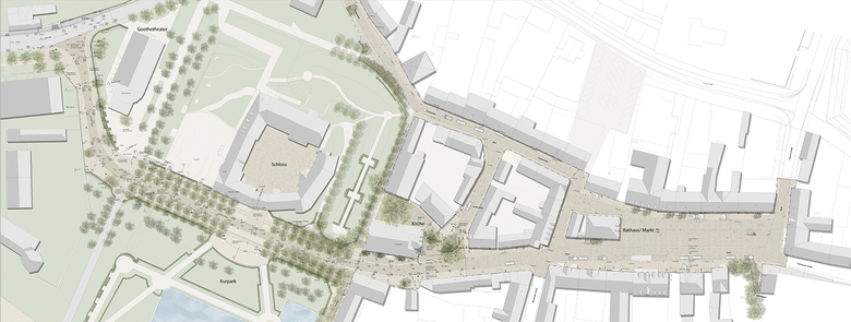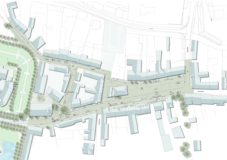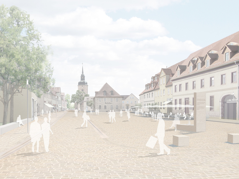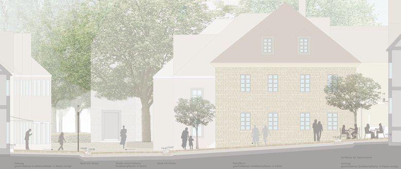 Der Entwurf zur Erneuerung des Platzes und des Umfeldes nimmt diesen Charakter der Stadt sensibel auf, indem er das städtebaulich historische Gefüge zeitgemäß interpretiert und zurückhaltend um wenige neue Elemente ergänzt. Der Marktplatz mit seinen homogenen, warmen und hellen Naturstein-Belägen unter teilweiser Verwendung von Bestandspflaster wird zu einer offenen, weiten Bühne, die den Platz scheinbar vergrößert und gleichzeitig das historische Altstadtgefüge zusammenhält. Einzelne Elemente wie die prägende, Solitärbauten rahmende Traufe aus Natursteinplatten oder eine einfache vertikale Wasser-Stele betonen mit ihrer Schlichtheit und Zurückhaltung die hohe Qualität dieses wertvollen städtebaulichen Kulturgutes.