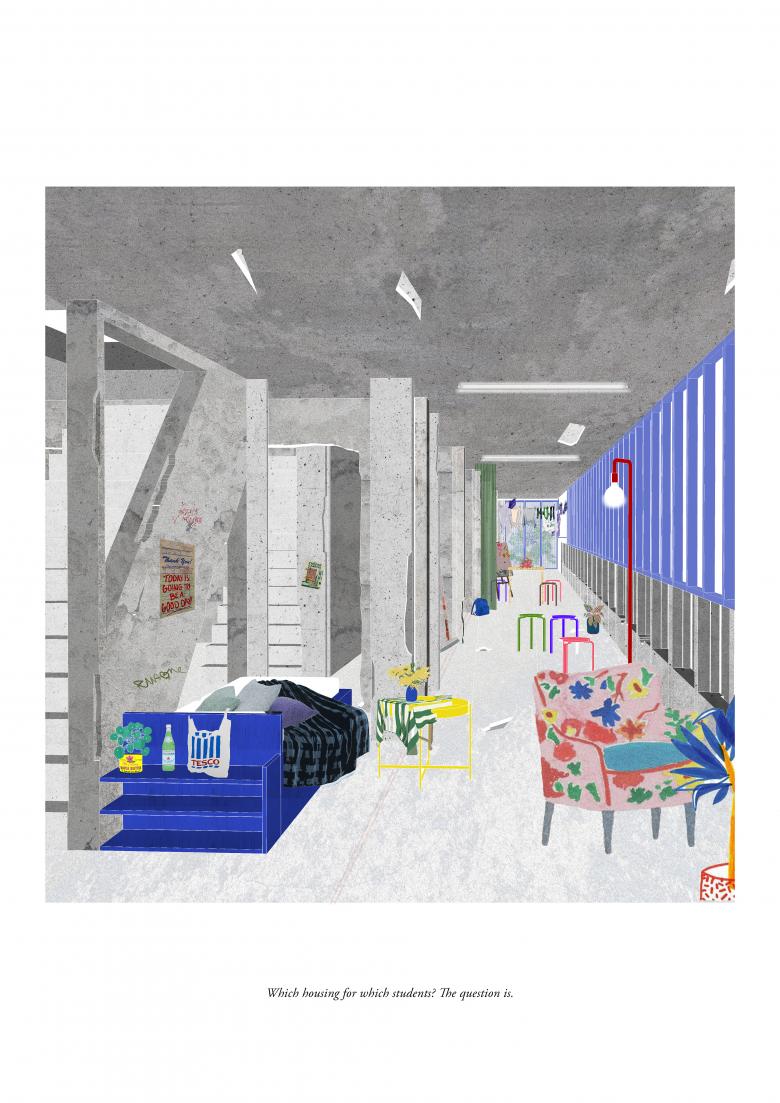 In London, the crisis of student housing is worrying. Privatization of the sector has led to a 67% rise in rents, forcing 1/5th of students to live in unhealthy and over-occupied conditions. This project proposes to rethink student housing through the very act of repair. It is guided by two key principles - adaptability and appropriation - and inspired by two references: the approach of John Habraken towards flexible housing and the work of Simone and Lucien Kroll in relation to experimentation.