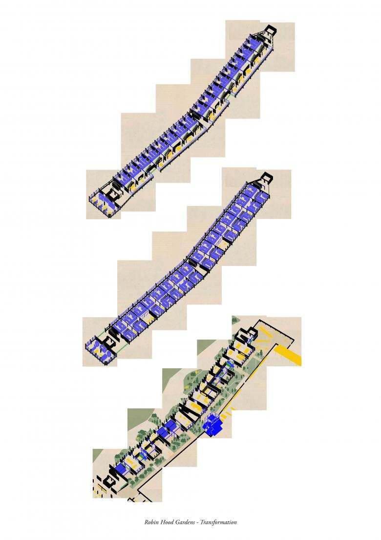 Robin Hood Gardens serves as a case study in order to explore the potential of post-war housing. Our intervention goes beyond a simple rehabilitation. It aims to give buildings the opportunity to evolve over time, while respecting its values. We believe in an architecture that considers history as a living material, placing users at the center and encouraging appropriation.