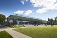 The pebble-shaped openings incorporate entrances to the underground commercial space, and are located either side of the bisecting road. Partially planted and with occasional seating areas along their route, as well as coffeeshops, they recall the gentle slopes of a valley or stepped tea fields. With escalators alongside for accessibility, entrances merge with the surrounding landscape, with only their canopies visible from the green land above. Another entrance is via the new four-floor commercial building. The structure is located next to the office tower, aesthetically uniting the site's recent phases of development through materials.