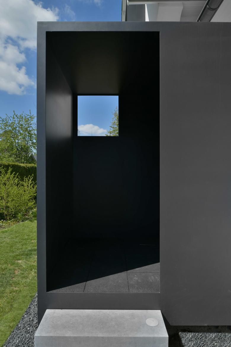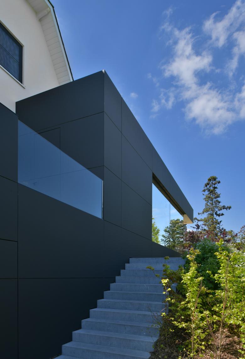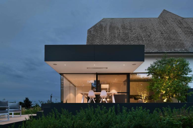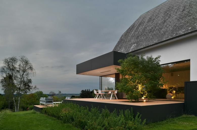 Le volume initial bâti est complété, sur l’ensemble de ses élévations, par de nouvelles interventions contemporaines contrastant avec le vocabulaire traditionnel initial.