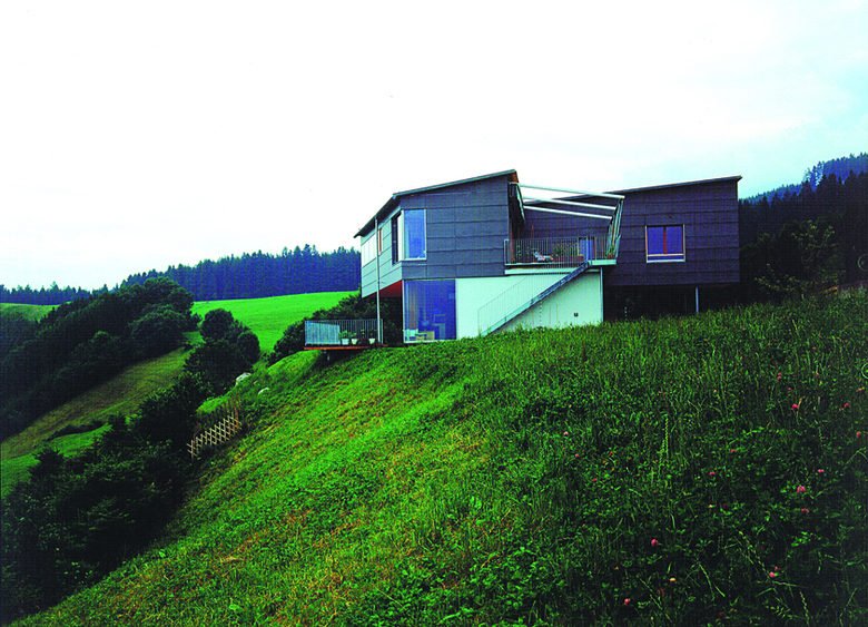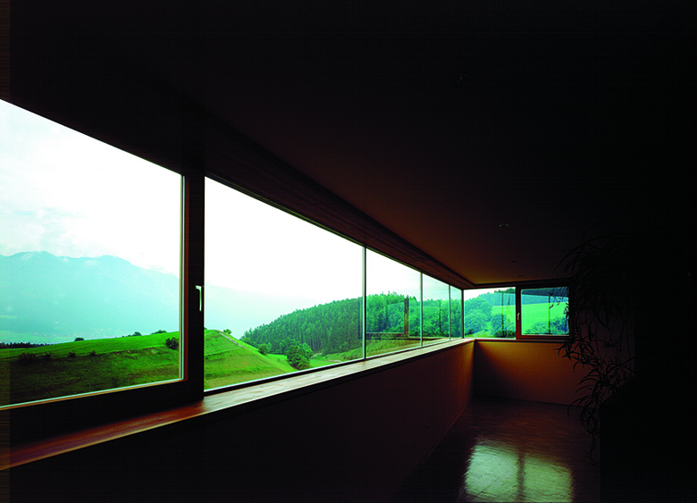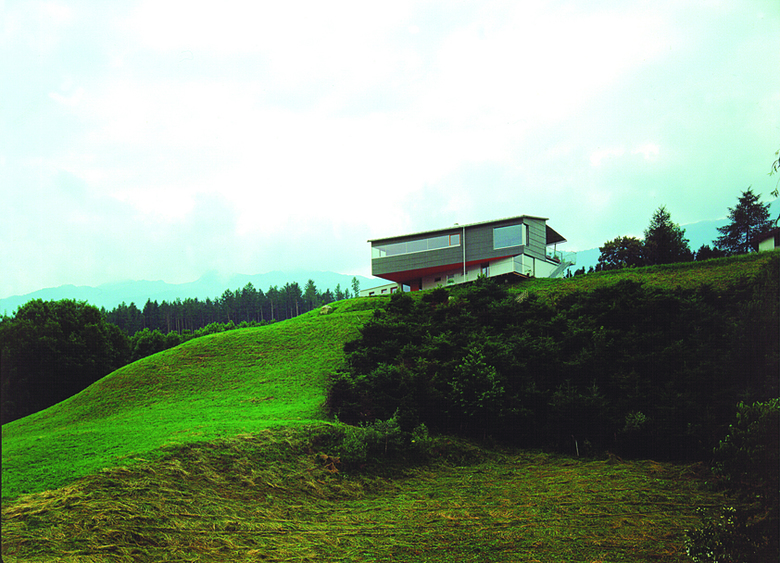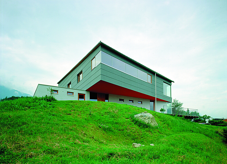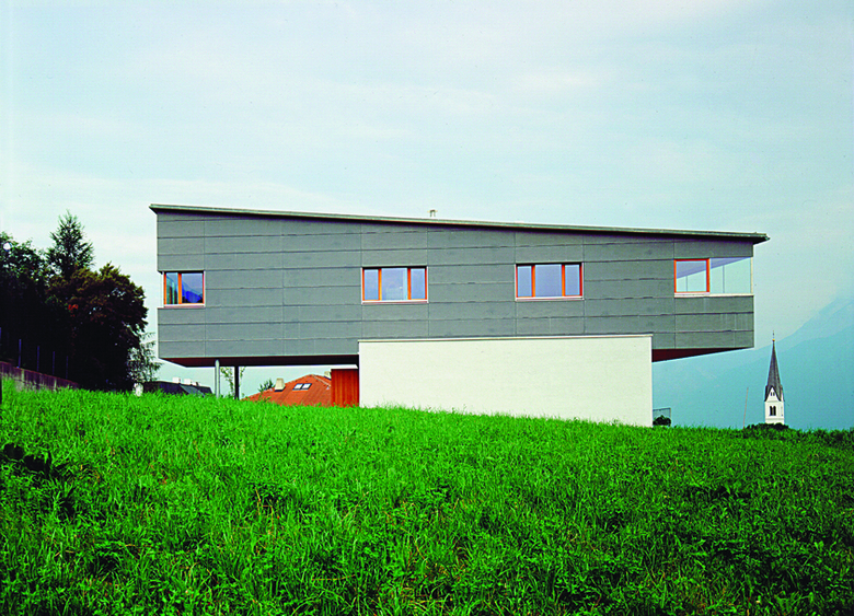 Die Entwurfsparameter dieses Einfamilienhauses in Aldrans sind einerseits bestimmt von einem atemberaubenden Bergpanorama, andererseits von einer Orientierung gegen Süden. Das Haus, das auch von zwei Familien bewohnt werden könnte, stellt eine Komposition aus einem verputzten Quader und einem 3-dimensionalen Polygon bedeckt mit Faserplatten dar. Das Pultdach passt sich der unsichtbaren Hülle der vorherrschenden gesetzlichen Bestimmungen an. Aufgrund der winterlichen Beschattung im Erdgeschoss wurden dort die Schlafzimmer untergebracht und im Obergeschoss ein großer, offener Wohn- und Essbereich mit vorgelagerter Terrasse geschaffen.