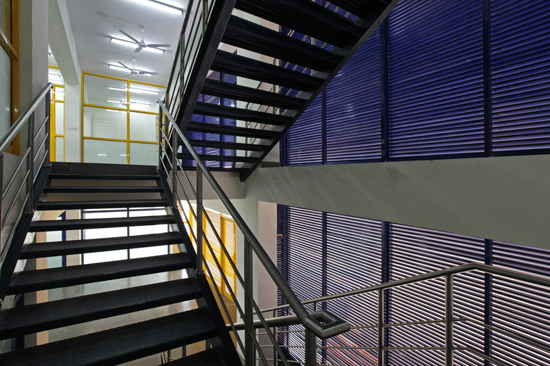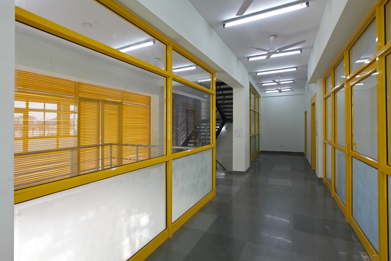 The choice of primary colors that combine the yellow and blue louvered façade and brightly ventilated areas seem radical for this forgotten area of Delhi. Yet these combinations of colors announce the presence of a contemporary treatment centre for the poorest of the poor. Inside the building, the glass partitioned consulting rooms and the bright ventilated waiting spaces, have created a unique treatment environment for the poorest of patients. This is a treatment centre where the infected and addicted will get not only medical attention but also counseling.