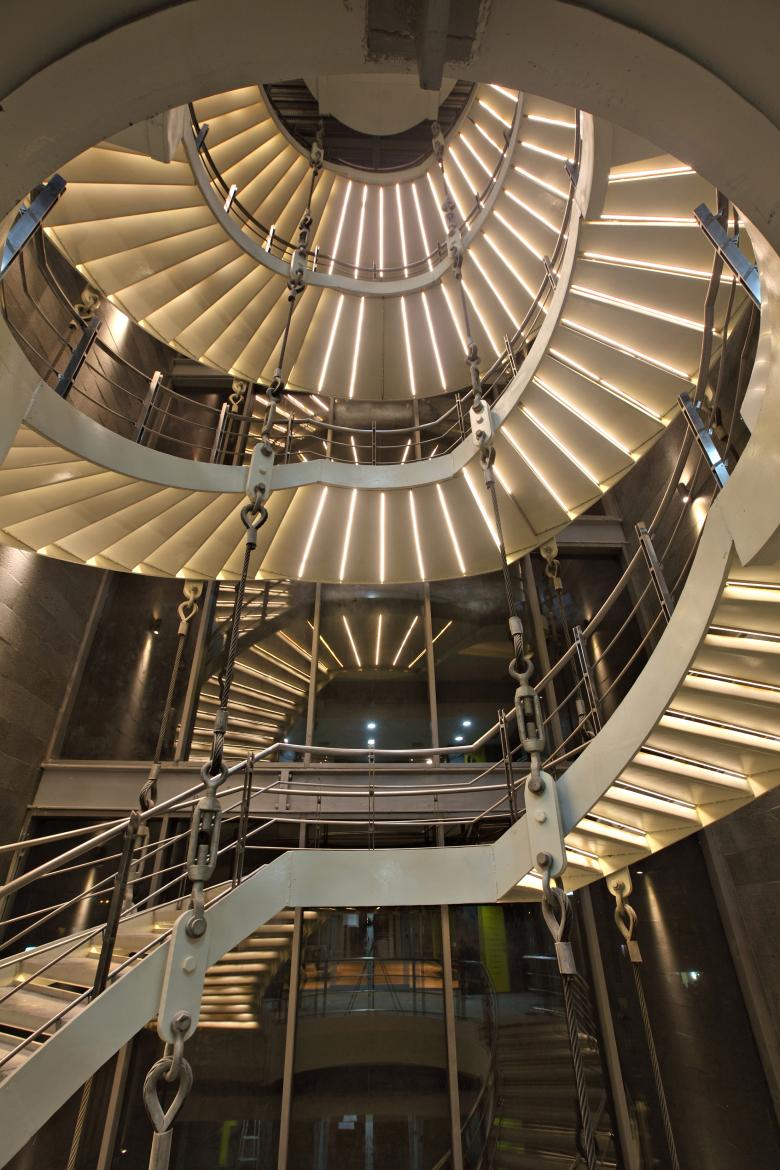 The building uses a large proportion of re-used material and an extremely high percentage of easily renewable materials. The building is defined by a unique span free steel structure which is set outside of the main building envelope and designed on the principle of a stabilised cube which is diagonally braced.