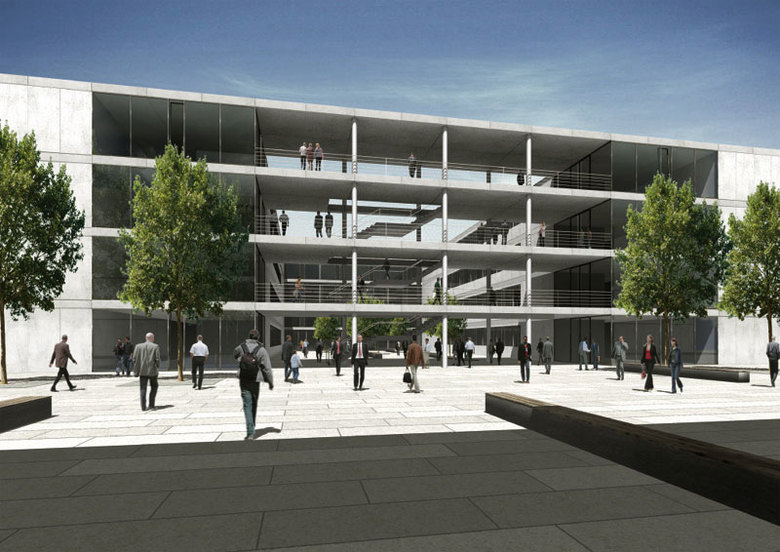 Gegenstand des Wettbewerbs: Planung, Errichtung und Finanzierung des 1. Erweiterungsneubaus bestehend aus einem Institutsgebäude mit Seminar-, Büro- und Rechner-übungsräumen mit vier Vollgeschossen, einem Zentral-gebäude mit Mensaria, Bibliothek und Prüfungsräumen, mit drei Vollgeschossen sowie den dazugehörigen Verkehrsanlagen.
