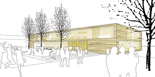 Die Längskante des Gebäudes führt zum Zentrum von Schule und Festhalle. Die Platzräume werden durch diesen Baukörper klar gefasst. Die Freiraumabfolge ergibt spannungsvolle Übergänge. Die Freiflächen sind den Nutzungen richtig zugeordnet. Die Raumnutzungen sind im Grundriss wie in den Ebenen funktional zueinander richtig positioniert.