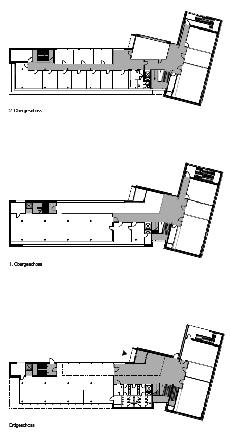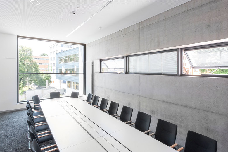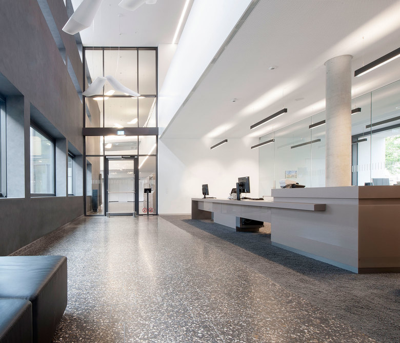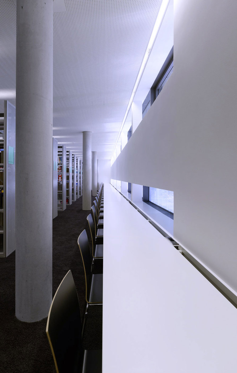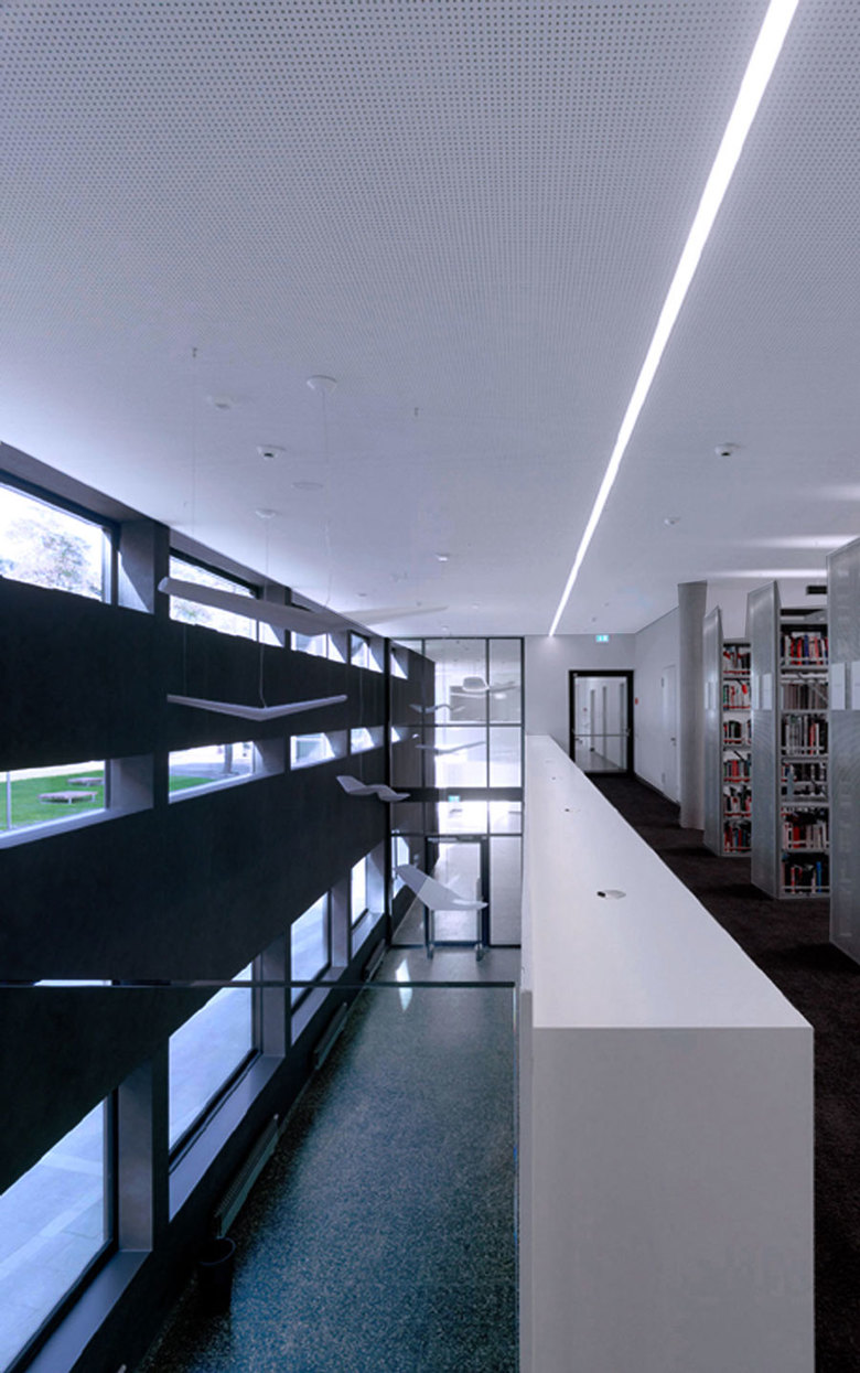 Der zweigeschossige Luftraum erstreckt sich vom Foyer bis in die Bibliothek. Im EG befinden sich Ausleihe, Leselounge und Arbeitsplätze. Im 1. OG sind Buchstellflächen und weitere Arbeitsbereiche angeordnet. Im 2. OG befinden sich Büroflächen der Fakultät Wirtschaft und der Besprechungsraum mit großzügiger Aussicht. Im Seminarriegel an der Uhlandstraße werden pro Geschoss zwei Unterrichtsräume angeboten, deren Größe durch eine mobile Trennwand variiert werden kann.
