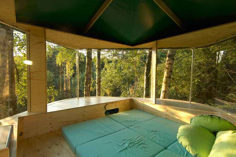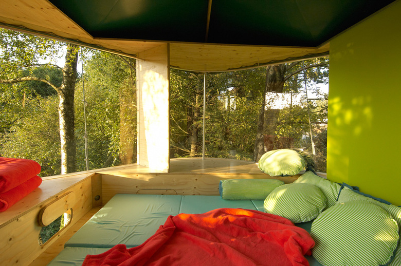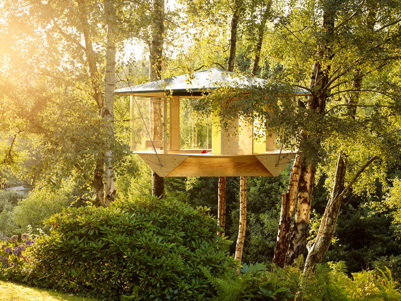 Der Bausatz kann von Familien problemlos gemeinsam aufgebaut und in den Bäumen positioniert werden. Mit seiner grünen Mütze aus Planenstoff hängt der kleine Holzbau zwischen den Bäumen und passt sich in seine natürliche Umgebung ein. Dabei hinterlässt er keinerlei Schäden oder Spuren, seine Stahlseile sind die einzigen Berührungspunkte mit den umgebenden Bäumen - gepolstert und in einem günstigen, steilen Winkel.