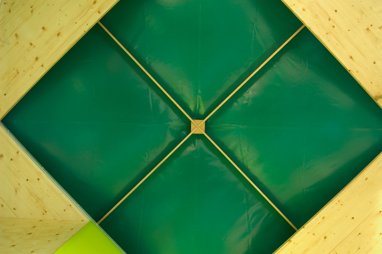 Wichtig für einen schwebenden Bau ist Leichtigkeit - sowohl optisch als auch physisch. Als Grundbaustoff kommen wetterfest verleimte, 21mm starke Platten aus WISA Spruce zum Einsatz, ein solides und preiswertes Material, das auch ästhetische Qualitäten hat. Seine hohe Steifigkeit erhält das Baumhaus aber erst durch die drei gleichförmigen, gebogenen Acrylglasscheiben, die herkömmliche aufwändige Aussteifungen überflüssig machen. Dies spart Gewicht und macht das Baumhaus in der Horizontalen fast völlig transparent. So werden Konstruktion und Geometrie zum entscheidenden, gestaltgebenden Element.