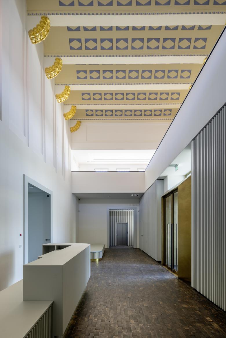 Durch eine intelligente Umverteilung des Raumprogramms entsteht auf der Westseite zum Platanenhain Platz für ein neues Café, das nun auch barrierefrei erschlossen ist. Zwischen Ausstellungsgebäude und Hochzeitsturm wird durch sensiblen Rückbau vorausgegangener Umbauten ein neuer repräsentativer Raum möglich, der sich in seiner architektonischen Ausformulierung eindeutig als Bauteil der 2020er Jahre zu erkennen gibt und so zusammen mit vielen weiteren sorgsam entwickelten Details dem ikonischen Bauwerk eine weitere, heutige Zeitschicht hinzufügt.