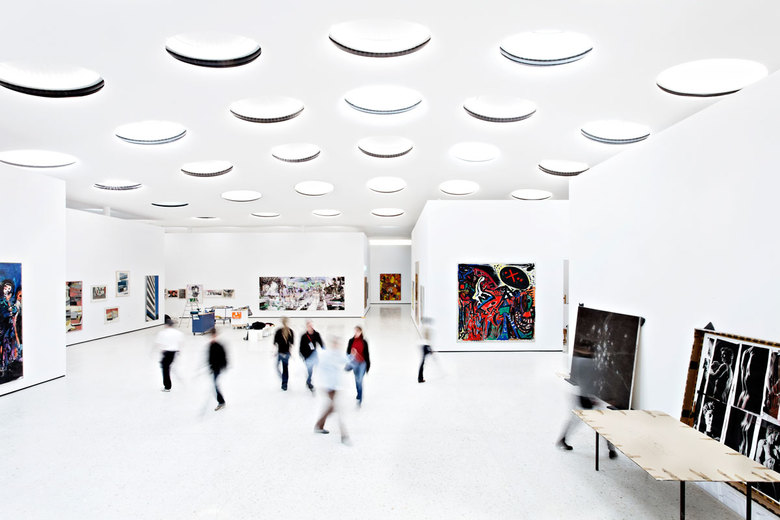 Über die gesamte Oberfläche der doppelt gekrümmten Deckenschale verteilen sich 195 Oberlichter, deren Durchmesser von 1,50 m in den Randbereichen bis zu 2,50 m am höchsten Punkt variieren. Diese speziell für das Städel entwickelten „Augen für die Kunst“ sind von außen begehbar und versorgen den Ausstellungsraum mit Tageslicht, welches durch integrierten LED und Sonnenschutzvorrichtungen verstärkt bzw. abgeschwächt werden kann. Die gesamte Decke wird von nur 12 schlanken Stahlbetonstützen getragen. 160 Bohrpfähle verankern den im Grundwasser liegenden Erweiterungsbau in der Erde und verhindern ein Aufschwimmen. Der Neubau wird durch 36 Erdsonden mit Wärme (im Winter) bzw. Kälte (im Sommer) versorgt, die bis zu einer Tiefe von 82 m im Boden stecken.