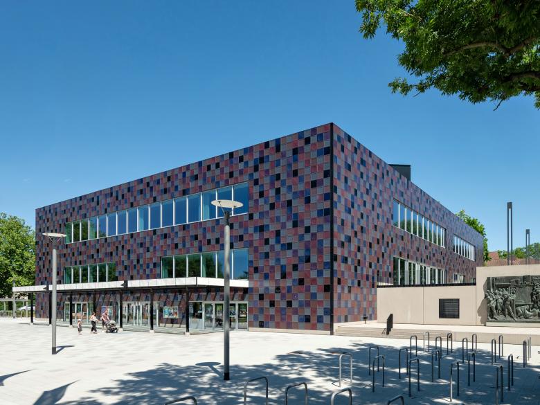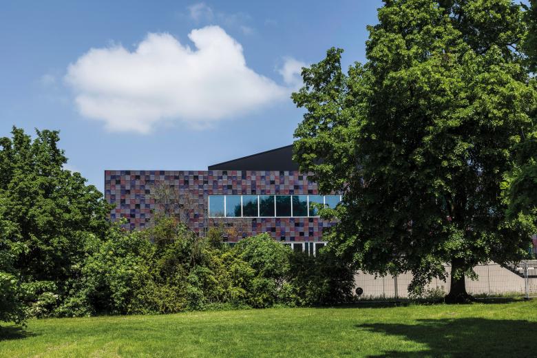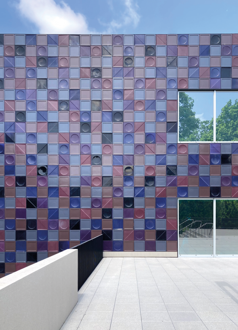 Ein besonderes Highlight ist dabei die Fassade. Die 50 x 50 cm großen Fassadenkacheln mit den fünf Farben und den kombinierten Motiven »Kreis« und »Dreieck« werden aus dem Bestand heraus gesichert und um Kacheln mit zwei Farben mit dem Motiv »Quadrat« ergänzt. Die neue Komposition erzeugt ein differenziertes Erscheinungsbild mit Flächenwirkung von Weitem und heterogenem Farbspiel aus der Nähe. Das Bestandsgebäude, das sich bisher im Volksmund mit den Spitznamen »Kachelofen« oder »Schwimmbad« zierte, erfährt so eine interessante Neuinterpretation.