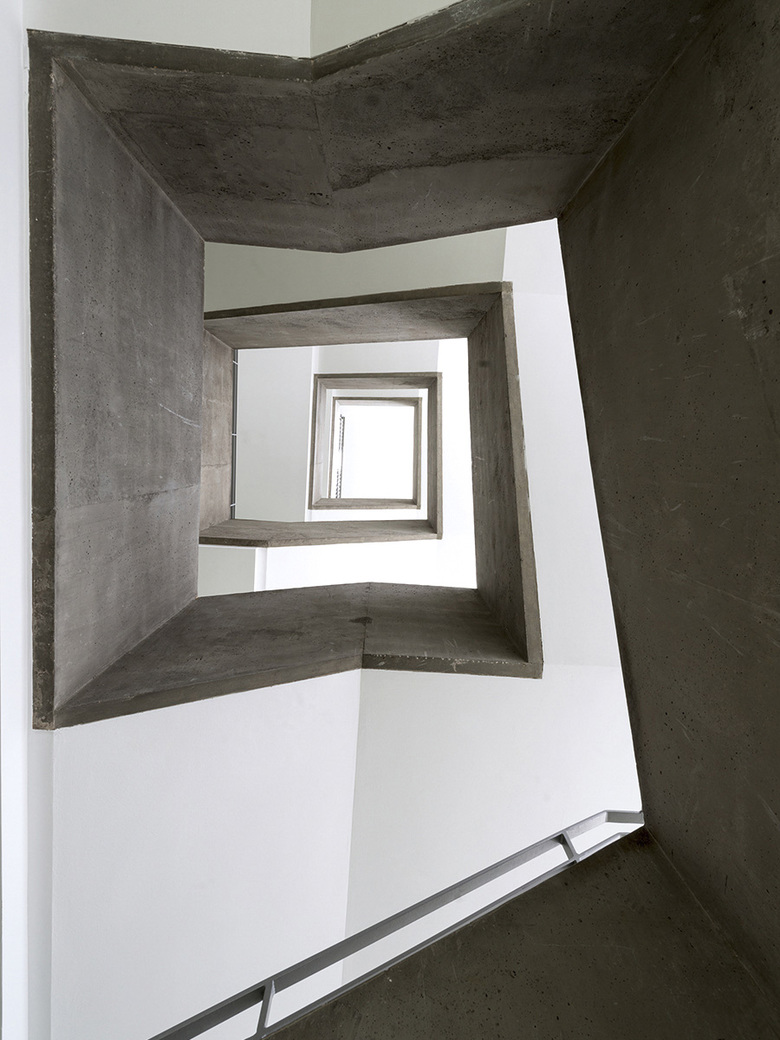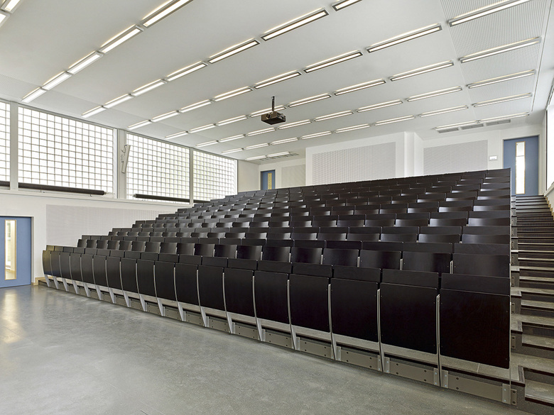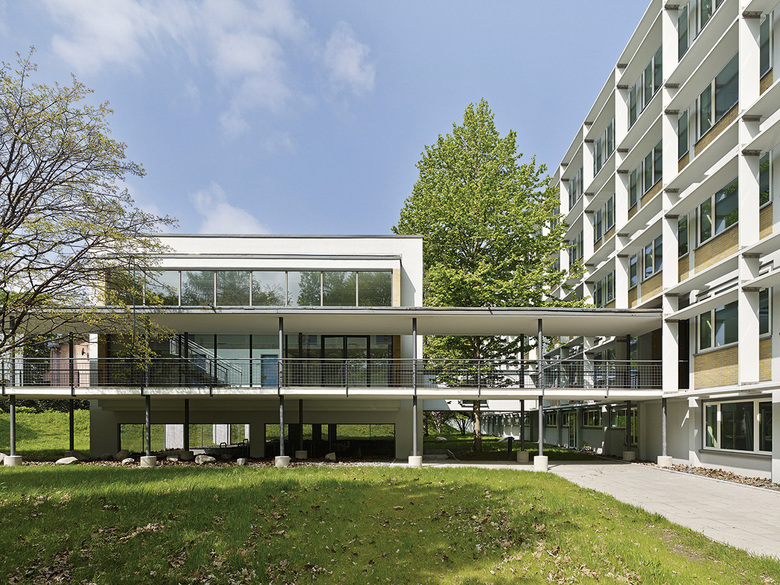 Das Hochschulgebäude auf dem Bockenheim-Campus in Frankfurt wurde 1954-57 von Ferdinand Kramer als Institut für Pharmazie und Lebensmittelchemie erstellt. Das Planungsteam um Ferdinand Kramer nutzte die vorhandene Senke auf dem Grundstück sehr geschickt und errichtete den Kopfbau, den Hörsaalkubus sowie den Zugangssteg auf Stahlpylonen. Die Konstruktion des Gebäudes basiert auf einem Betonstützenraster von 3,50m, die Gesamtbreite variiert: Der örtliche Laborkopfbau ist 19m breit, beim Hauptgebäude sind es 15m. Wie alle seine Bauten auf dem Campus hatte Kramer das Gebäude zwar zweckmäßig, reduziert auf einfache Materialien und streng orientiert am Bedarf des damaligen Nutzers geplant, jedoch immer mit dem Ziel, möglichst auch künftigen Anforderungen gerecht zu werden. SSP gewann 2009 den europaweiten Wettbewerb für die Sanierung und Umnutzung des Objektes zu einem Forschungszentrum für Biodiversität und Klima (BiK-F). Das Entwurfskonzept überzeugte mit der Grundidee, die moderne Nutzungsanforderungen an ein Laborgebäude, unter Beibehaltung der vorhandenen architektonischen Qualitäten, umzusetzen. Die Aufgabenstellung umfasste auch den Neubau einer Mesokosmenhalle als Speziallabor sowie Lehr- / Forschungsbereiche für 10 Professoren und 50 Doktoranten mit S1- und S2-Laboren. In der Entwurfsfindung nach dem Motto „das Gebäude im Sinne Ferdinand Kramers weiterzubauen“, wurde schnell deutlich dass das Gebäude über ein ungewöhnlich hohes Maß an Flexibilität verfügt und damit eine nachhaltige Modernisierung ohne allzu schwere Eingriffe realisierbar ist. So wurde die Denkmalgeschützte Fassade mit ihrem charakteristischen Raster und den gelbbraunen Klinkern vollständig erhalten und auch die bereits in den ´80 Jahren erneuerten charakteristischen Brises Soleil aus Stahlbeton-Fertigteilen nur malermäßig überarbeitet. Um einen gleichmäßigen U-Wert für die gesamte Außenwandfläche und darüber hinaus eine bündige Stützenvorderkante zu realisieren musste mit verschiedenen diffusionsoffenen Dämmlösungen reagiert werden. Während im 1. und 2. OG Brüstungsvormauerungen aus 20 cm dicken Porenbetonsteinen verwendet wurden, konnte im EG und im 3. Und 4. OG mineralische Dämmplatten von 6 cm stärke eingesetzt werden. Beide Systeme besitzen ähnliche Materialeigenschaften und erreichen annähernd gleiche Dämmwerte. Der Transmissionswärmeverlust konnte dadurch um ca. 50% gesenkt werden, das Gebäude erreicht Heute die Anforderung der EnEV 2009. Und dennoch musste das Gebäude aus brandschutz- und haustechnischen Gründen bis auf die Fassade, die tragende Grundkonstruktion und die Treppenräume zurückgebaut und danach sämtliche Innenwände und abhängten Decken neu errichten werden. Um die bereits vorhandenen Aufzugsschächte, Kramer hatte bereits vorgesorgt, an moderne Aufzugstechnik anzupassen und Versorgungsschächte nach heutigem Standard zu realisieren mussten an wenigen Stellen Deckenfelder entfernt werden. Die Technikzentrale die Heute deutlich mehr Platz beansprucht als vor 65 Jahren befindet sich Heute im Staffelgeschoss. Die filigranen Rippendecken, die Kramer im gesamten Gebäude verbaut hatte, erwiesen sich in der Modernisierung als Schwachpunkt innerhalb der tragenden Struktur des Gebäudes. So lagen die Armierungsstäbe vermutlich schon bei ihrer Entstehung teilweise frei und setzen bedingt durch Raumfeuchte über die Jahre Rost an. Um die volle statische Tragfähigkeit wieder herzustellen, wurden vorhandene Risse kraftschlüssig verpresst und anschließend die frei liegende Armierung Luftdicht mit Spachtelmasse bedeckt. Um den erforderlichen baulichen Brandschutz, gefordert war F90, zu gewährleisten wurde danach ein 2 cm dicker Spritzsputz, mit einer Schicht Sanierungsmörtel als Haftgrund, auf die Rippendecken aufgetragen. Eine weitere Herausforderung war die Integration eines Speziallabor Neubaukörpers in die bestehende historische Gebäudekomposition. Um den Eingriff in die städtebauliche Kontur zu minimieren wurde der Neubau der sogenannten Mesokosmenhalle zum Teil unter die Erde verlegt. Zu den weiteren besonderen Herausforderungen für das Projekt gehörten neben dem respektvollen Umgang mit einem Gebäude von kultureller Bedeutung die Gründung inkl. Bodenaustausch, Wasserhaltung, die denkmalgeschütze Fassade, Altlasten und Schadstoffe, Terminfristen für Fördergelder aus zwei unterschiedlichen Quellen, eine Betonsanierung und der Brandschutz. Das innovative Sanierungskonzept des Forschungszentrum BiK-F wurde bereits mehrfach ausgezeichnet: - German Design Award 2016, Nominierung - Deutscher Architekturpreis 2015, Anerkennung - Sanierungspreis 2015, Auszeichnung - AIT-Award 2014, Special Mention - DMK-Award für nachhaltiges Bauen 2014, Auszeichnung