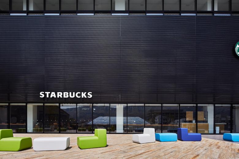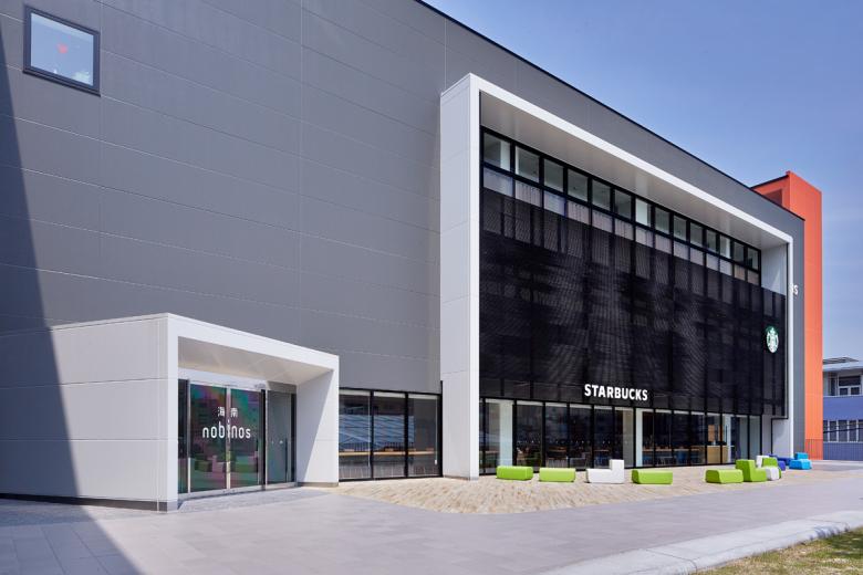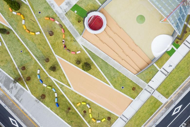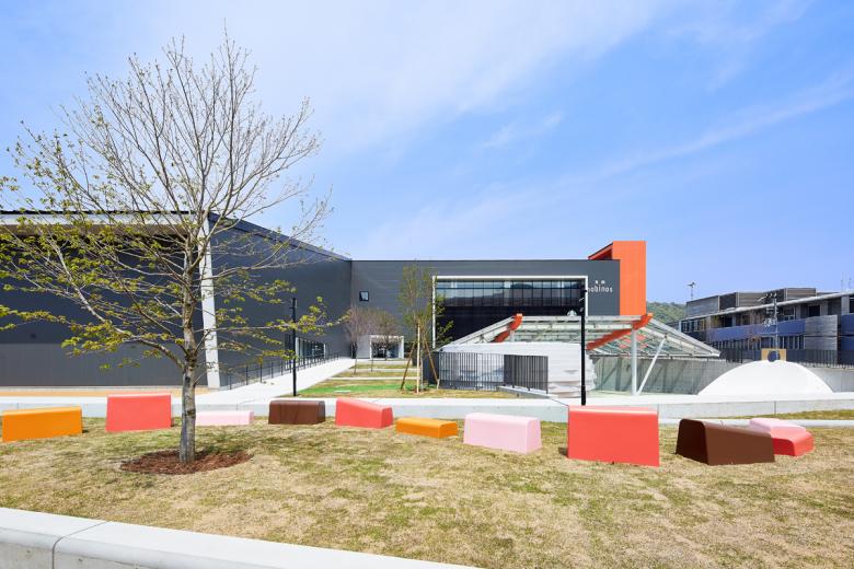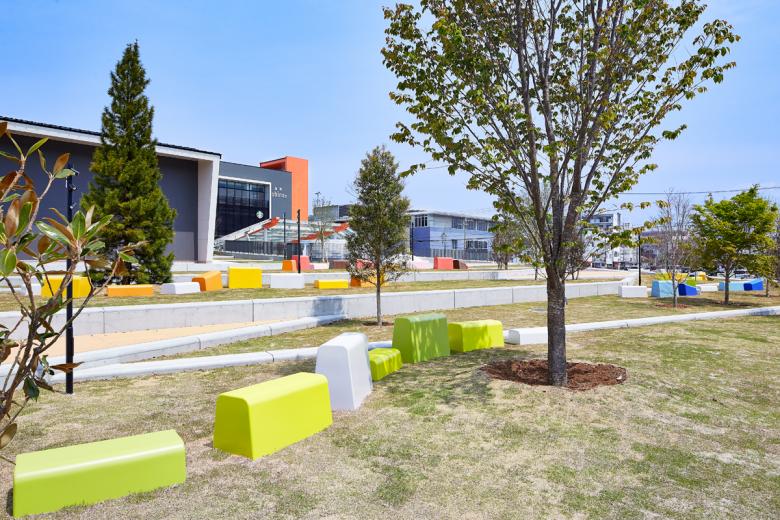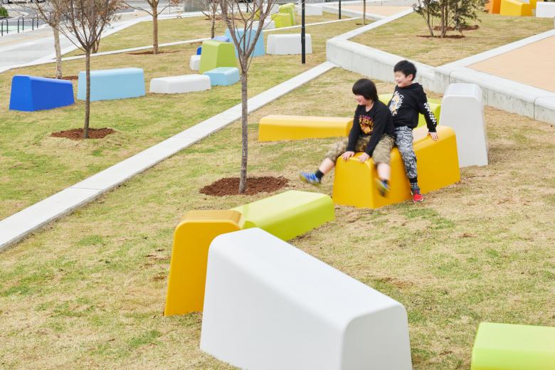全面を芝生とした斜面は、木陰と段差とファニチャーというシンプルな構成要素で多様な活動を受け入れられるように、大小様々な場として分節しながら棚田状に構成されています。丘に点在するファニチャーは「海南を構成する色」を抽出したカラーチップのようなデザインとし、サインやインテリアと連動して施設のアイデンティティを形成しています。