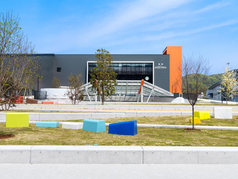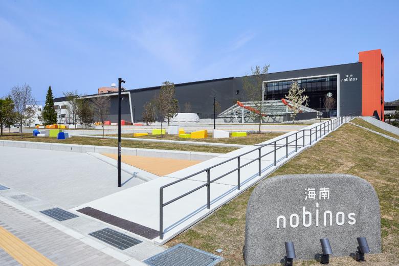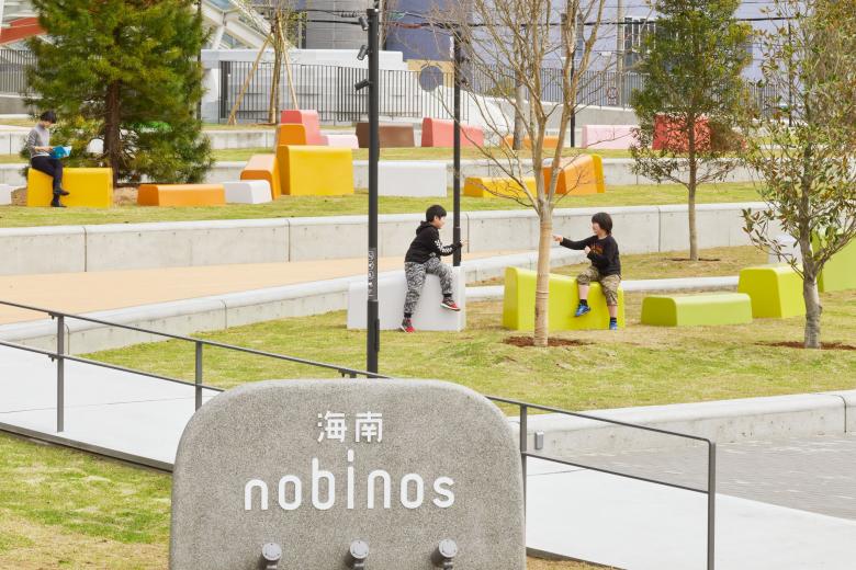 海南市では老朽化を理由として移転する市庁舎の跡地に、図書館を主として市民の溜まり場、生涯学習支援、子育て支援などの機能をもつ複合施設、海南nobinosを建設することとなり、私たちはそのランドスケープデザインを手がけました。