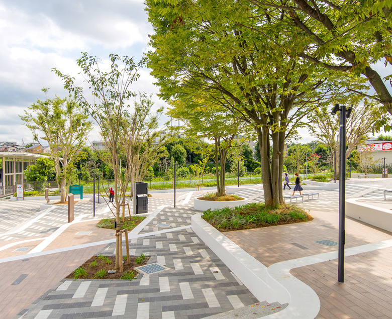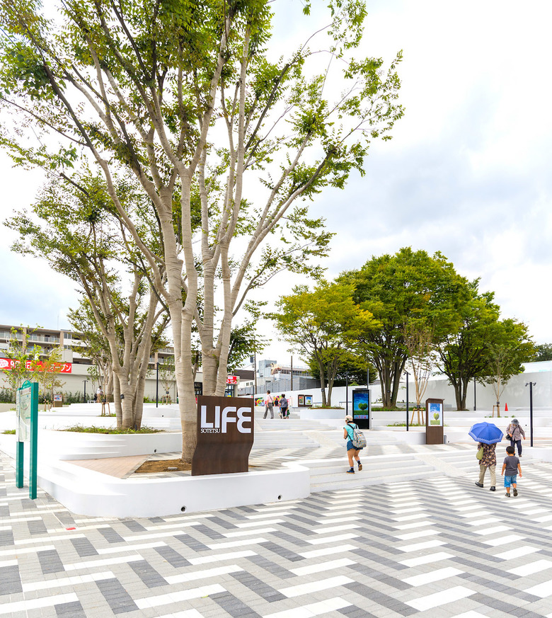 駅前の再開発に伴う駅前広場のデザインを担当しました。駅と街に約4mもの高低差が存在する南万騎が原駅は、これまで急な階段や坂道で駅と街が分断していました。そこで、駅と街を結ぶ緩やかなスロープを通した上で、それ以外の部分を棚田状の広場空間としてデザインしました。 段状につらなる幾つものスペースは、イベントをしたり、座って休んだりと、人が活動できるスペースとして生まれ変わりました。また、駅ができた頃から植えられている巨大な樹木をできるだけ残すことで、広場に良好な木陰をもたらしています。