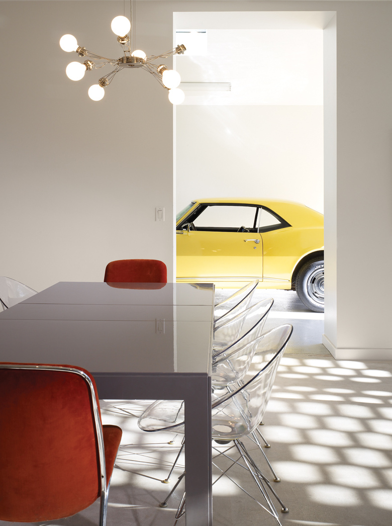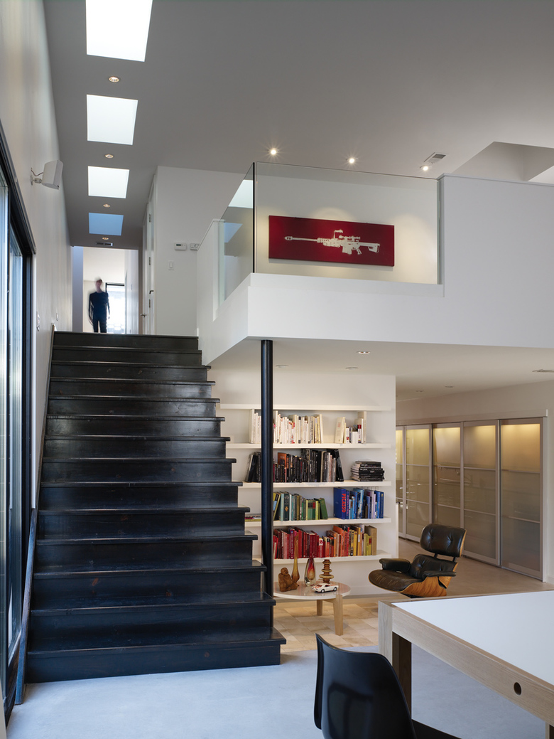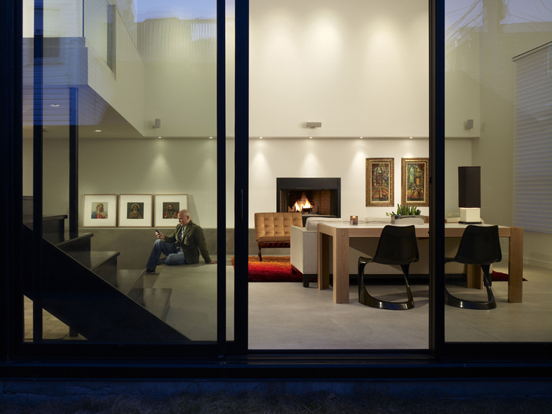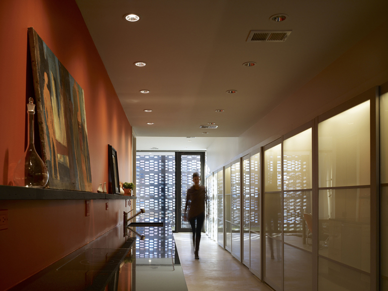 Variation in ceiling heights and floor levels weaves together the two-story garden at the front of the house with the single-story volume at the back through a cascading section. The screen animates the garden and interior with dappled sunlight, establishing a visual connection to and from the street. Rectangular voids in the screen throw hexagonal patterns of light inside. At night, the pattern reverses, and the screen becomes a lantern.