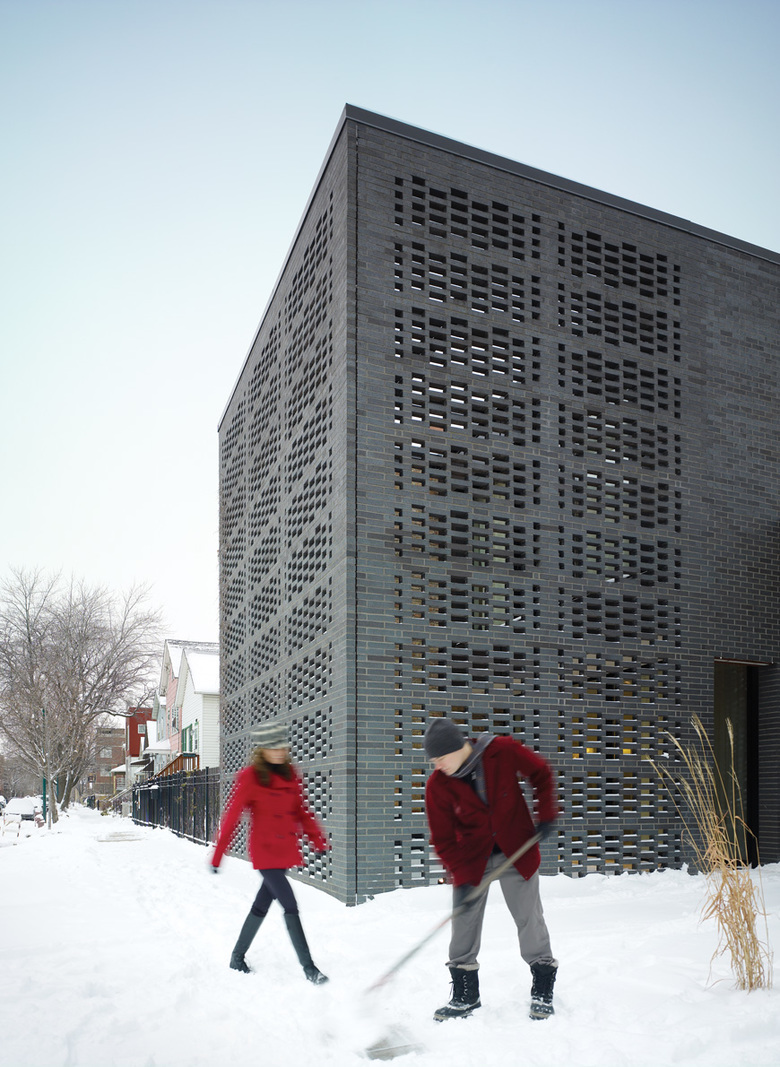 The Brick Weave House sits on the footprint of a century-old stable on an eclectic block of Chicago’s West Town neighborhood. Removing the original front walls and roof created a garden through subtraction, one which is surrounded by a porous, one-wythe-thick brick screen that both reveals and encloses the private courtyard and house beyond.