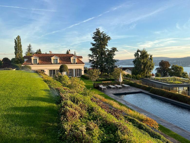 CONTEMPORARY CLASSICAL MANSION is located in a prestigious area close to Lake Geneva on a plot of 2500.00 m². The mansion is nestled in a beautiful and leafy surrounding. With a living space over three floors, the mansion features ten bedrooms and sev¬en bathrooms including en-suite wellness areas. A highlight is the noble staircase in the inner courtyard which is flooded with abundant daylight through the skylight window. The mansion is also equipped with a garage with the parking capacity for four cars, and a large outdoor garden area including pergola and pool.