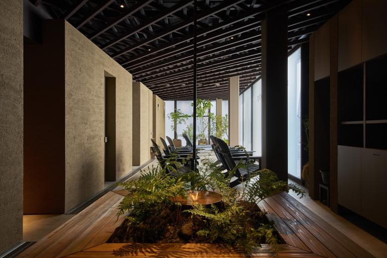 壁には土の左官仕上げを施し、柔らかで温かみのある質感が包まれるような安心感を生み出します。木材は、サウナ特有の熱や湿度に適応しつつ、触れたときのぬくもりや心地よい香りを大切に。館内の随所に配された緑が、自然のやすらぎをもたらし、都市にいながらも、どこか屋外にいるような感覚を生み出します。